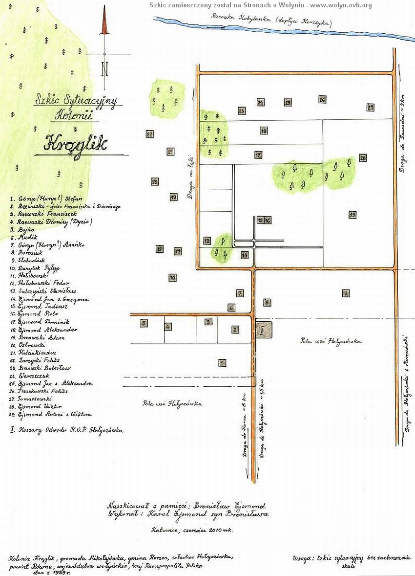 WYKAZ GOSPODARSTW, stan w około 1939 r. | 1. | EJSMOND | Jan 1885 - s. Grzegorza i Zofii z d. Ejsmond (Ejsmont), żona Eugenia 1886 z d. Nagalewska, wdowa po Łabęskim, dzieci: Antoni 1920, Jadwiga 1921, Bronisław 1923, Józef 1925. | 2. | EJSMOND | Dominik 15.07.1890-2.10.1975 - s. Grzegorza i Zofii, żona (śl.1928) Maria 23.06.1909-26.10.1998 z d. Paszkowska z Wierzycy - c. Atanazego i Teodory z d. Chodakowska, dzieci: Zbyszek 1929-1929, Krystyna 16.09.1930-17.09.1972, Zdzisław 28.03.1932. Dominik - żołnierz żandarmerii wojskowej, został aresztowany 25.05.1941r. przez NKWD, potem dostał się do formowanej w ZSRR przez gen. Andersa Armii Polskiej. Marię z dziećmi wywieziono na Sybir, skąd uciekli do Teheranu, gdzie odnalazła Dominika. Po wojnie osiedlili się w Londynie. | 3. | EJSMOND | Aleksander 1891 - s. Grzegorza i Zofii, żona Elżbieta 1901 z d. Korzeniowska, dzieci: Zofia 1920, Maria 1921, Zygmunt 1923, Leontyna 1936 | 4. | PASZKOWSKI | Jan 1887 - s. Floriana i Wiktorii z d. Sydonowicz, żona Aleksandra 1894 z d. Ejsmond - c. Grzegorza i Zofii, dzieci: Maria 1918, Kazimierz 1922, Józef 1924, Zofia 1925, Mieczysław 1927 | 5. | SALCZYŃSKI | Stanisław 1901, żona Eugenia 1897 z d. Ejsmond - c. Grzegorza i Zofii, córka Alina 1930 | 6. | NAGALEWSKI | Tadeusz - s. Jana i Ewy z d. Paszkowska, żona Helena r.1899 z d. Ejsmond - córka Grzegorza i Zofii, syn Antoni 1920 | 7. | EJSMOND | Piotr 1902 - s. Grzegorza i Zofii, żona Paulina 1909 z d. Tyczkowska, dzieci: Irena 1930, Wanda 1933 | 8. | EJSMOND | Tadeusz 1904 - s. Grzegorza i Zofii, żona Jadwiga 1913 z d. Wilczyńska, dzieci: Danuta 1932, Jarosław 1935 | 9. | EJSMOND | Grzegorz 1855, żona Zofia 1866 z d. Ejsmont, dzieci: Jan 1885, Dominik 1890, Aleksander 1891, Aleksandra 1894, Eugenia 1897, Helena 1899, Piotr 1902, Tadeusz 1904, Marceli 1908-07.1916. | 10. | EJSMOND | Wiktor ~1860, wyznania prawosławnego. | 11. | EJSMOND | Antoni - s. Wiktora ~1900, wyznania prawosławnego | 12. | EJSMOND | Jan ~1890 - s. Aleksandra, żona?, dzieci: Anisia, Aleksander | 13. | BRZOWSKI | Bolesław, żona Anisia z d. Ejsmond - c. Jana (poz.12). | 14. | BRZOWSKI | Adam | 15. | GÓRYN | /Huryn?/ Stefan | 16. | GÓRYN | /Huryn?/ Anańko | 17. | RZEWUSKA | IN., wdowa, mąż zm.~1930r., dwóch synów /poz.18 i 19/ | 18. | RZEWUSKI | Franciszek | 19. | RZEWUSKI | Dionizy /Dyzio/ | 20. | BOJKO | - narodowości ukraińskiej | 21. | MUDIK | - narodowości ukraińskiej | 22. | BOROSIUK | - narodowości ukraińskiej | 23. | SŁOBODIUK | - narodowości ukraińskiej | 24. | DANYLUK | Pyłyp - narodowości ukraińskiej | 25. | HOŁUBOWSKI | /Gołębiowski?/ zm.~1933, syn Fedor (poz.26) | 26. | HOŁUBOWSKI | /Gołębiowski?/ Fedor | 27. | OSTROWSKI | IN. | 28. | KOŚCIUKIEWICZ | Wincenty 1882 - s. Hieronima i Pauliny z d. Mileniewska, żona (śl.1919) Maria z d. Kowalska, (spotykana odmiana nazwiska: Kościuszkiewicz) | 29. | ZARZYCKI | Feliks | 30. | NECKARZ | Franciszek 1868-1943 ( zamordowany przez Ukraińców na swoim podwórku jesienią 1943r.), żona Maria 1874, córka Maria (Trzeszczakowska). | | TRZESZCZKOWSKI | Feliks.1901, żona Maria 1905 z d. Neckarz, dzieci: Mieczysław 1925, Władysław 1928, Ludwik 1930, Halina 1934 (Dalecka) i Zofia 1939. Po wojnie zamieszkali w Karlinie,w województwie zachodniopomorskim. V.n.: Trzaskowski. | 31. | TOMASZEWSKI | Jan 1889 - s. Marcina i Anny, żona Tekla 1892 z d. Jankowska - c. Andrzeja (s.Antoniego i Zofii z d. Korzeniowska) i Pauliny z d. Gajewska/Hajewska, dzieci: Hanna, Józefa, Antoni 1933. Po wojnie w Garnki woj.zachodniopomorskie. Tekla miała brata Antoniego (ż.Tekla Kołkowska). | 32. | WERESZCZUK | IN. | Brak informacji. Proszę Państwa o pomoc w uzupełnianiu wykazu. | | L.p. |   | Informacje |   | 1. | Karol Ejsmond | [październik 2009] poz.1-8, [listopad 2009] poz. 9, [kwiecień 2010] uzup. w poz. 9, [maj 2010] poz. 10, uzup. w poz. 2, [czerwiec 2010] szkic i poz. 11-32 z przekazu mego ojca Bronisława Ejsmonda zamieszkałego w Katowicach, | emanru(a)poczta.fm | 2. | Andrzej Mielcarek | [od październik 2009] uzup. poz. 1, 4, 6, 28, 31 dzięki "Wykazom osób..." -opr. ks. W.W. Żurek. | Strony o Wołyniu | 3. | Antoni Kościukiewicz | [marzec 2011] uzup. w poz. 28 | krzyszttof_kosc(a)poczta.onet.pl | 4. | Danuta Jach | [sierpień 2014] uzup. w poz. 31. | danuta.dom(a)wp.pl. | 5. | Kornelia Overom | c. Haliny Daleckiej. [lipiec 2016] uzup. w poz. 30. | nnnela(a)yahoo.com |