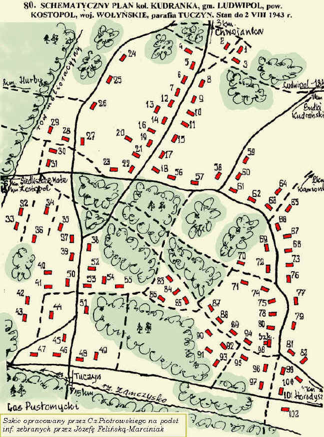 1943 (kum.: Tomasz Bagiński i Helena Bagińska panna z Kudranki). | 4. | BAGIŃSKI | Feliks - s. Dominika i Józefy z d. Bagińska, żona Paulina z d. Żukowska. Rodzina 9 osób. | 5. | BAGIŃSKI | Ludwik 1879-2.08.1943 - s. Dominika i Józefy z d. Bagińska, żona Weronika 1894-2.08.1943 z d. Mikłaszewska, rodzina 11 osób - Józefa 1923-2.08.1943, Ignacy 2.07.1939-2.08.1943 (kum.: Paweł Mikłaszewski i Marcelina Bagińska z Kudranki). | 6. | ŻUKOWSKI | Florian 1878-2.08.1943 - s. Jana i Teofili z d. Gnitecka, żona (śl.1919) Bronisława Petronela 1881-2.08.1943. z d. Giżycka. Rodzina 6 osób - Marian 1924-2.08.1943, Stefania 1928-2.08.1943 | 7. | ŻUKOWSKI | Ferdynand 1881-2.08.1943 - s. Jana i Teofili z d. Gnitecka, żona (śl.1918) Maria 1887-2.08.1943 z d. Gnitecka. Rodzina 7 osób - Anna 1918-2.08.1943, Florentyna 1922-2.08.1943 | 8. | BAGIŃSKI | Florian. Rodzina 3 osoby. | | BAGIŃSKI | Antoni - s. Adama?, żona Józefa z d. Grajewska. Rodzina 8 osób ? w tym córka Aniela 11.07.1940 (kum.: Adolf Bagiński i Anna Żygadło żona Mariana) | 9. | BOCZKOWSKI | ? Józef i żona Pelagia z d. Chołodecka (prawdopodobnie siostra Bolesława), dzieci: Antonina 1910, Stanisława 1912 1910 (m.Gracjan Misiewicz, zam. Leonówka), Antoni 1914, Marcel 1916, Józefa 1919, Adela 1922, Jadwiga 1925. Z całego rodzeństwa żyje tylko Jadwiga (info 2004 r.), po mężu Szuba, mieszka w Warszawie. Rodzina Boczkowskich w 1943 ratując życie została wywieziona na roboty do Niemiec. Po wojnie osiedli głównie na Pomorzu. | 10. | BAGIŃSKI | Tomasz - s. Adama i Anieli, żona Karolina. Rodzina 4 osoby | 11. | BAGIŃSKI | Jan, żona Maria z d. Gołdyńska, dzieci: Mirosława