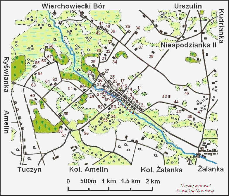 WYKAZ GOSPODARSTW, stan w około 1939 r. Lista zaczyna się od mieszkańców mieszkających od strony Żalanki i idzie w kierunku zachodnim, gdyż tak szła numeracja domów. 1. | BAGIŃSKI | Jan, żona Teresa +1943 - w zaawansowanej ciąży i ich sześcioro dzieci +1943 w tym Władysława, Ukraińcy zakłuli w stogu siana w którym się schowali. Uratowało się rodzeństwo nocujące w kryjówce w polu: Halina i Władysław. | 2. | PIOTROWSKI | Władysław +2.02.1942 (atak astmy), żona Marcelina z d. Bagińska, dzieci: Stanisława 1925, Mirosława 1930, Zofia 1932, Władysława 1934, Romualda 1936, Stefan 1938, Waldemar 1940. | 3. | BAGIŃSKI | Stanisław, żona Janina, 6 dzieci | 4. | DOMALEWSKI | IN., rodzina. | 5. | BABISZKIEWICZ | Antoni, żona IN., 5 dzieci | 6. | POLIKOWSKI | Adam 1897 - s. Tomasza i Anieli z d. Bagińska, żona IN. (Maria Kamińska?), 2 dzieci | 7. | BAGIŃSKI | Antoni, żona Anna, syn IN. | 8. | RESZCZYŃSKI | Antoni 1899, żona IN., 5 dzieci, m.in.: Anatol, Janina 1928, Ryszard. | 9. | PIOTROWSKI | Stanisław, żona Marynia, 4 dzieci. | 10. | FILICZKOWSKI | Kalasanty - s. Szymona i Marianny z d. Urbanowicz Fliliczkowska (wdowa po Kazimierzu, bracie Szymona), żona (śl.1919) Maria z d. Słowińska - c. Józefa i Heleny z d. Bogucka, dzieci: Piotr 1920-1943, Genowefa 1922, Bronisława 1924, Helena 1928, Władysława 1929, Stanisława 1930, Bogdan 1932, Józef 1932-1939 (zmarł). Po wojnie na Opolszczyźnie. Genowefa i Bronisława były na robotach przymusowych w Niemczech. Szymon miał brata Aleksandra (ż.Paulina Zarzycka, śl.1881, synowie: Hieronim, Feliks). | 11. | BAGIŃSKI | Antoni + brat + siostra (prawdopodobnie pan Piotrowski pomylił ich z tymi poniższymi Urbanowiczami) | 12. | URBANOWICZ | Helena 1865 z d. Reszczyńska z Urszulina - c. Piotra i Franciszki z d. Jasińska, wdowa po Józefie 1858 - s. Stanisława i Apolonii z d. Sewruk, synowie (kawalerowie): Grzegorz 1894-1943 i Antoni 1899, córka? IN - nie wiadomo czy z nimi mieszkała. | 13. | BRONOWICKI | Jan