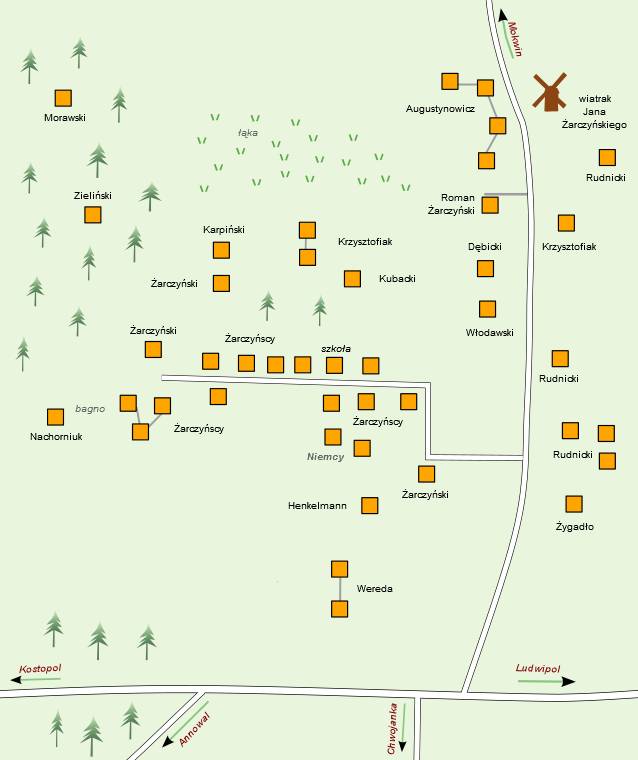 WYKAZ GOSPODARSTW, stan z około 1939 r. (poz. 1-32 uporządkowane w kolejności posadowienia domostw z kierunku od Mokwina do Annopola) | 1. | AUGUSTYNOWICZ | Jan - s. IN i Elżbiety 1870-18.09.1940 z d. Żarczyńska (rodzina greckokatolicka). | 2. | AUGUSTYNOWICZ | Władysław. | 3. | AUGUSTYNOWICZ | Aleksander. | 4. | AUGUSTYNOWICZ | Mikołaj, synowie Iwan i Adam byli w bandach UPA. | 5. | ŻARCZYŃSKI | Roman 1885 - s. Piotra 1849-1933 (s.Mateusza i Franciszki z d. Prokopowicz) i Pauliny +1915 z d. Hajdamowicz (śl.1871, Kazimirka, prawdopodobnie była z Lipnik), żona (śl.1912) Eugenia 1894 z d. Domalewska z Ilnik.- c. Franciszka i Marianny z d. Marcinkowska, dzieci: Emilia (po mężu Urbanowicz) 11.09.1938, Wiktor (USA), Janina 1926 (mąż Adam Halczuk (nazwisko przekręcone po wojnie na Halczyk) z Rudni Łęczyńskiej s. Antoniego i Natalii z d. Chodorowska), Leokadia (po m.Borgula). Rodzeństwo Romana to Stefania (Rudnicka - poz. 13),