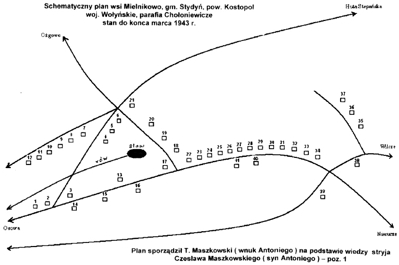 - s. Narcyza, żona (śl.1929) Jadwiga z d. Wysocka z Nesześci, dzieci: Marceli, Ignacy, Rozalia. | 24. | MASZKOWSKI | Narcyz, żona Narcyza, synowie: Fortunat, Franciszek, Hipolit, Zygmunt, Bronisław, Jan i 12 dzieci IN. | 25. | DAWIDOWICZ | Piotr, ż. Hanka, s. Franciszek, s. Wacław. | 26. | DAWIDOWICZ | Teofila z d. Sulikowska - c. Adama i Ewy z d. Górska, wdowa po Michale - s Adama i Józefy, dzieci: Elżbieta (po m.Twardowska), Janina (m.Zygmunt Maszkowski), Bronisław (ż.Bolesława z d Basińska - c. Cezarego i Walentyny z Osówki), Weronika (m.Jan Dawidowicz - s Pawła i Emilii z Osówki). | 27. | MASZKOWSKI | Adam - s. Franciszka i Pauliny z d. Żołędziewska, szewc, żona Józefa z d. Dawidowicz - c. Hipolita i Zofii z d. Brodowska, dzieci: Józef (+koło Szczecina), Lucyna (+Wągrowiec). Po wojnie: Wiśniewko, Wielkopolska. | 28. | MASZKOWSKI | Bronisław