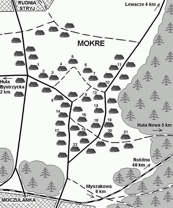 WYKAZ GOSPODARSTW, stan w około 1939 r. (najdalej do połowy 1945 r.) 1. | MORAWSKI | Antoni 1882 - s. Adama (Murawski) i Kamili z d. Bronowicka, żona Petronela z d. Boczkowska; córki: Rozalia i Maria, synowie: Walenty, Bronisław, Adam i Czesław. | 2. | ŻYGADŁO | Feliks ("Czarny") - s. Aleksandra i Apoloni z d. Bagińska, żona (śl.1919) Adela z d. Kuriata, dzieci: Regina, Paulina, Leokadia, Piotr i Walenty. Babcia Apolonia. | 3. | ŻYGADŁO | Leon, żona Leontyna, dzieci: Władysława i Danuta. | 4. | ŻYGADŁO | Roman 20.03.1905-20.12.1981, żona Bronisława 25.03.1903-26.03.1995, dzieci: Rozalia 1925, Apolonia 25.12.1930, Kazimierz 1933, Julian 15.06.1937-07.02.2001, Franciszek 1939-1939, Mieczysław 1940. | 5. | ŻYGADŁO | Anastazja (*Bereżniaki) z d. Kuriata - c. Wojciecha i Rozalii z. d. Kuriata, wdowa po Janie, dzieci: Franciszek, Stanisław 1921, Walenty, Czesław, Kazimierz i Marian. | 6. | ŻYGADŁO | Teofila - zmarły mąż prawdopodobnie Felicjan, dzieci: Walenty, Stanisław, Rozalia, Helena i Jadwiga. | 7. | ŻYGADŁO | Franciszek, żona Bronisława, dzieci: Jan, Alfred i Antoni. | 8. | DĄBROWSKI | Gracjan, wdowiec z 5 dzieci IN. - imię jednej z córek Katarzyna (mieszka obecnie w Pustkowie Wilczkowickim). Być może Gracjan był synem Stanisława i Stanisławy z d. Pawłowska (śl.1897). | 9. | DZIEKAŃSKI | Feliks, żona Maria, 6 dzieci IN. m. in. Kazimierz. | | 10. | MORAWSKI | Teofil, żona Bronisława, dzieci Tadeusz, Henryk i Kazimierz. Teofil zginął w 1945 r prawdopodobnie na Wale Pomorskim. Henryk. zamieszkał w województwie zachodniopomorskim. | | 11. | BOCZKOWSKI | Antoni 1910, żona (śl.1937) Antonina 1919 z d. Gostkiewicz, 3 dzieci IN. | | 12. | ŻURAWSKI | Roman, żona Adela z d. Stachowska z Jakubówki, dzieci: Zygmunt, Halina, Marian, Genowefa i Piotr. | | 13. | ŻYGADŁO | Piotr - wdowiec, 3 synów. | | 14. | ŻYGADŁO | Franciszek - s. Piotra, żona Helena, dzieci: Apolonia, Genowefa, Teresa, Anna | | 15. | MATUSIEWICZ | Aniela - wdowa z 3 dzieci IN. | | 16. | BAGIŃSKI | Roman, żona Julia, 3 synów IN. | | 17. | ŻYGADŁO | Józef z żoną i 3 dzieci IN. | | 18. | BOCZKOWSKI | Teofil 1906, żona Antonina 1911 (*Myszakowa) z d. Sawicka - c. Konstantego i Dominiki Łykus, dzieci: Elżbieta, Barbara, Zygmunt, Wanda. | | 19. | DĄBROWSKI | Witalis, żona Bronisława i 3 dzieci IN. | | 20. | DĄBROWSKI | Józef - s. Jana i Anastazji, żona (śl.1927) Józefa 3.04.1903 (tu*) z d. Kuriata - c. Wiktora i Wincentyny (w Moczulance), dzieci: Alfred (Ferdynand), Walenty, Piotr, Zdzisław. Po wojnie Zachodniopomorskie. Ferdynand po wojnie wrócił w rodzinne strony, mieszkał w Mokrym i się ożenił. Jest pochowany razem z żoną na cmentarzu w Moczulance. | | 21. | DZIEKAŃSKI | Adam, żona Teofila; córki: Marianna, Adela, Bronisława i syn Czesław. | | 22. | BAGIŃSKI | Jan, żona Bronisława; synowie; Antoni, Marcel, Marian | Ponadto z nieustaloną lokalizacją gospodarstwa (możliwe, że część mieszkała wspólnie z wymienionymi powyżej): | 23. | BOCZKOWSKI | Stanisław, żona Filomena z d. Jaworska, dzieci: Rozalia, Antonina, Jan, Janina, Józef. | 24. | ŻURAWSKI | Piotr 1905 - s. Franciszka i Anieli z d. Drapikowska, gajowy, żona Leokadia 1900 z d. Michniewicz - c. Tomasza i Marii, dzieci: Maria 1923 i Wacław 1928. Mieszkali w pierwszym domu od strony Moczulanki, na lewo od drogi. Zesłani na Syberię.(źr.2). Piotr z armią gen. Andersa trafił do Anglii, a następnie wyemigrowali do USA. | 25. | KUCHARSKI | Tomasz 11.06.1893 - s. Stanisława i Anny z d. Żygadło, żona Bronisława 8.09.1899 z d. Bagińska - c. Franciszka i Anieli z d. Rudnicka, dzieci: Anatol, Janina, Władysława, Danuta, Romanina. Po wojnie: Gałów k/Wrocławia. | 26. | HAŁASOWSKI | Jan, legionista ochrony KOP, przybył do Mokrego w 1920 r. z Grabownicy Starzyńskiej, żona Rozalia z d. Żygadło - c. Tomasza z Moczulanki, wdowa po Hieronimie Żygadło (ich dzieci poniżej), dzieci: Aniela, Rafalina, Tadeusz. | | ŻYGADŁO | dzieci Hieronima 1885 - s. Augustyna i Karoliny z d. Mucharowska i Rozalii (śl.1915): Stanisław i Bronisław. | 27. | SZACHNIEWICZ | Felicjan/Feliks - s. Adolfa i Filomeny z d. Żygadło, żona Bronisława z d. Kuriata - c. Piotra i Pauliny, dzieci: Kazimierz, Marian, Mieczysław, Irena, Czesława | 28. | SZACHNIEWICZ | Józef - s. Mikołaja i Apoloni z d. Kuriata, żona (śl.1919) Leonarda z d. Bagińska, dzieci: Rozalia, Zofia, Tadeusz, Jan, Genowefa i Fredek (Alfred) | 29. | WĘGŁOWSKI | Gracjan, żona Aniela, córka Stanisława (mieszka obecnie w Sobótce), | 30. | ŻYGADŁO | Antoni, żona Jadwiga, dzieci: Leokadia, syn IN, | 31. | ŻYGADŁO | Jan - s. Józefa (s.Marcina i Katarzyny z d. Michniewicz) i Olimpii z d. Rudnicka (wdowa po Pawle Borowskim *1843 - s.Bartłomieja i Julianny z d. Sosnowska), żona Maria z d. Żygadło - c. Tomasza z Moczulanki, dzieci: Kacper, Marceli, Halina, | 32. | DZIEKAŃSKI | Felicjan 1916, żona (śl.1936) Maria 1916 z d. Dąbrowska, dzieci: Tadeusz 1937, Danuta 1939, Alfred 1943. (może to rodzina wymieniona w poz.9 ?) | 33. | REWUCKI | Leon 1909-1943 (zamordowany w Korcu) - s. Aleksandra i Katarzyny z d. Szeremeta, żona (śl.1936) Rafalina 1913 z d. Chodorowska, dzieci: Zygmunt, Halina, Anna. | | REWUCKI | Aleksander +1943? (zginął) - s. Aleksandra i Katarzyny, żona (śl.1936) Kamila z d. Bagińska z Huty Starej - c. Ambrożego i Stanisławy z d. Słowińska, dzieci: Czesława i Irena. Nie wiadomo w którym domu mieszkali, może razem z bratem. Po wojnie w Żernikach Wrocławskich. | 34. | BOCZKOWSKI | Józef 1907- s. Piotra i Marianny z d. Żygadło, żona Janina z d. Szulc. Siostra Józefa - Aniela (Tyszecka) mieszkała w Starykach. | 35. | RUDNICKI | Wincenty. Siostra? Zofia (Dembicka) w Majdanie Mokwińskim. | 36. | ŻURAWSKI | Franciszek, żona Aniela z d. Drapikowska, dzieci: Karol, Piotr (poz. 24), Maria, Stanisław, Józef, Jan. Karol pracował w kamieniołomach granitu w Moczulance. W czas