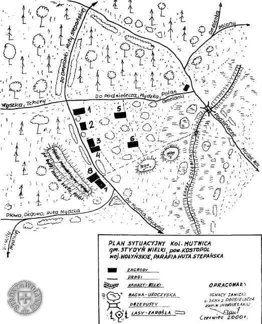 Projekt WYKAZU GOSPODARSTW, stan w około 1939 r. Domyślnie, jeżeli nie wpisano inaczej, wszyscy urodzeni są w tej miejscowości. | 1. | DAWIDOWICZ | Hipolit 1885-1941 (+Huta Stepańska) - s. Ludwika i Pauliny z d. Sulikowska, żona Malwina 1893-1944 (*Podsielecze, zm. na tyfus w 1944 w Przebrażu) z d. Maszkowska - c. Pawła i Franciszki z d. Sulikowska, dzieci: Anastazja (po m. Chorążyczewska), Józefa (po m. Horhder, zm. w 1941r.), Mikołaj (wzięty do armii radzieckiej, nie powrócił), Genowefa, Ludwik 1927, Stanisław 1933 i Marceli. | 2. | RAKOWSKI | Zenon 22.07.1913-11.07.1965 (tu*) - s. Adama i Antoniny z d. Sulikowska, żona (śl.26.12.1938) Marianna 8.09.1919-15.08.1973 (*Taraż) z d. Drzewiecka z Milaszowa - c. Floriana i Anieli z d. Zakrzewska, dzieci: Mieczysław 14.01.1940-30.04.1992 (*Podsielecze), Teresa 26.07.1941-02.1993 (*Podsielecze), Krystyna 28.01.1943 (*Podsielecze). Po wojnie rodzina zamieszkała w Sierakowie Śląskim. | 3. | SULIKOWSKI | Hipolit 1884 - s. Kazimierza i Zofii z d. Rakowska, wdowiec, II żona (śl.1919) Teofila 1889 z d. Janicka - c. Walentego i Tekli z d. Maszkowska, dzieci: Józefa 1912 (miała syna r.1934); Stanisław (poz.4); Mikołaj 1922 - w 1940 zabrany do armii czerwonej, po rozpoczęciu wojny niemiecko-sowieckiej zaginął bez śladu; Jan 1924. Po wojnie w powiecie Antonin w poznańskim. Rodzeństwo Teofili z Janickich to: Jan i Paweł z Podsielecza, Stanisława (Cichocka) z Lad, Maria (Oziębłowska) z Huty Mydzkiej, Paulina (Chorążyczewska) z Wilczych i Józefa. | 4. | SULIKOWSKI | Stanisław ~1914 - s. Hipolita i Teofili, żona Katarzyna 1917, dzieci: Danuta 1938, Mieczysław 1940. Po wojnie w województwie wrocławskim. | 5. | MICHNIEWICZ | Jan 1915, żona Franciszka 1919, dziecko niemowlę. Ewakuowali się do Grabiny. | 6. | RUDNICKI | Feliks 1889, żona Rozalia 1891, syn Antoni (poniżej). Rodzice Antoniego uratowali się ucieczką. | | RUDNICKI | Antoni 1915-1943, żona Paulina 1916-1943 z d. Sulikowska z Podsielecza, syn Czesław 1940-1943. Zamordowani przez banderowców w dniach 21-22.07.43 w lasach koło Temnego wraz z rodzicami i rodzeństwem Pauliny. | 7. | DĄBROWSKI | Jan (gajowy w nadleśnictwie radziwiłłowskim) 1886 - s. Władysława i Teofili z d. Rammel, żona (śl.1908) Karolina 1890 z d. Dawidowicz, syn Franciszek 1923. Jan z synem wywiezieni na Sybir. Jan tam umiera, a Franciszek dostaje się do Andersa, po wojnie osiada w Belgii. Mieli jeszcze 3 dzieci: Antonina - wdowa z trojgiem dzieci, wśród nich Władysław wywieziony przez Niemców na roboty gdzie zginął. Antonina z dwójka pozostałych wyjechała do Sarn do rodziny po mężu. Dalsze losy nieznane. Druga córka Jana, po mężu Kobylańska (Anna?), mieszkała w Podsieleczu. Trzecia córka Jadwiga (Pawłowska, patrz niżej). | 8. | PAWŁOWSKI | Jan 1914, żona Jadwiga 1915 z d. Dąbrowska - c. Jana i Karoliny, troje dzieci 2-7 lat. Uciekli do Sarn. Po wojnie w Chicago. | Brak więcej informacji. Proszę Państwa o pomoc w uzupełnianiu wykazu. | | L.p. |   | Informacje |   | 1. | Leszek Rześniowiecki | [luty 2010] poz. 1-3 | lrzesniowiecki(a)gmail.com | 2. | Jarosław Burek | [lipiec-sierpień 2010] uzup. poz. 1, 3 i 2, dodane poz. 4-8. (lata jak i imiona niektórych podanych osób mogą trochę odbiegać od rzeczywistości) z opracowania Ignacego Janickiego na podstawie relacji Julii Puławskiej (z d. Oziębłowskiej z Huty Mydzkiej), Jana Sulikowskiego z Mutwicy oraz Pauliny Sulikowskiej (z Podsielecza z d. Basińskiej), [wrzesień 2010] zdjęcie planu sytuacyjnego (adaptacja: Red.). [listopad 2010] uzup. poz. 2 dzięki "Wykazom osób..." -opr. ks. W.W. Żurek. | human1967(a)o2.pl | 3. | Andrzej Mielcarek | [sierpień 2010] uzup. poz. 3 i 7 dzięki "Wykazom osób z akt parafialnych..." -opr. ks. W.W. Żurek. | Strony o Wołyniu | 4. | Carmen Thiele | [październik 2010] dotyczy poz. 7. Bitte um nachricht über die familie Dabrowski aus Mutwica vater Jan der wildhüter mutter Karolina beides meine urgrosseltern mein grossvater ist Wladyslaw Dabrowski er ist nicht in deutschen werken gestorben wir dachten alle in Mutwica sind tot ich habe jahrelang gesucht und das hier ist die erste spur meiner familie bitte um hilfe gruss. Carmen - tochter von Janina Emilia Karolina Dabrowski. | carmen.thiele(a)gmx.de | 5. | Krzysztof Sajdak | [grudzień 2012] uzup. poz. 2. | krzysztof.sajdak(a)gmail.com | 6. | Edmund Galla | [luty 2013] korekta i uzup. poz. 2, źródło: Wykaz osób z akt paraf. Diec. Łuckiej" ks.W.W.Żurka t.VII s.636 oraz w uzgodnieniu i z upoważnienia córek Krystyny i Janiny ur w 1948r. Podsielecze w dowodach osobistych: Mieczysława, Teresy i Krystyny | ewa.galla(a)gmail.com |