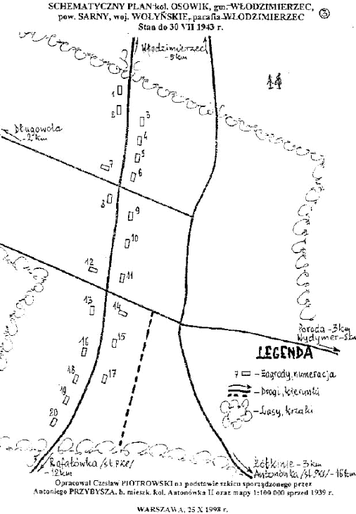WYKAZ GOSPODARSTW, stan w około 1939 r. (najdalej do 30.07.1943 r.) | 1. | MATYJASZCZYK | Jan 1897, żona Jadwiga 1900, dzieci: Tomasz 1927, Feliks 1929, Zbigniew 1931, Helena 1933. | | 2. | MATYJASZCZYK | Wojciech 1898, żona Weronika 1900, dzieci: Józef 1925, Marian 1927. | | 3. | SULIKOWSKA | Aniela 1896, wdowa, córki: Janina 1923, Jadwiga 1927. | | 4. | GREJNER | Wacław 1897, żona Marianna 1899, syn Józef 1921. | | 5. | PAWELEC | Jakub 1898, żona Waleria 1900, dzieci: Jan 1923, Irena 1926. | | 6. | ZIELIŃSKI | Stanisław 1894, I żona Weronika z d. Matyjaszczyk, dzieci: Tomasz 1920, Jan 1923 (po śmierci matki zamieszkali u jej rodziców) i Tadeusz 1925 (wychowywany przez babcię Eleonorę w Porodzie); partnerka Olga Nakoniecka 1920 - c. Wacławy z pierwszego małżeństwa, syn Roman 1927 (autor I wersji wykazu, po wojnie w Głogowie); II żona Wacława 1899 (wdowa po Nakonieckim), dzieci: Józef 1931 i Władysław 1936. Po wojnie na Śląsku. | | 7. | MAJEWSKI | Władysław 1893, żona Magdalena 1895, dzieci: Jan 1924, Maria 1925, Władysław 1927. | | 8. | MAJEWSKI | Wiktor 1894, żona Zofia 1896, dzieci: Wiktor 1923, Józef 1925, Jadwiga 1929, Marianna 1933. | | 9. | SZADURSKI | Jan 1896, żona Maria 1898, dzieci: Karol 1921 i Wanda 1926. | | 10. | SZADURSKI | Tomasz 1893, żona Emilia 1896, dzieci: Jan 1917, Walenty 1923, Katarzyna 1926. | | 11. | SULIKOWSKI | Feliks 1900, żona Jadwiga 1903, dzieci: Jan 1925, Roman 1927. | | 12. | DOBROWOLSKI | Ignacy 1895, żona Marianna 1897, dzieci: Irena 1924, Regina 1926, Halina 1929, Kazimiera 1933. | | 13. | DOBROWOLSKI | Jan 1900, żona Honorata 1902, dzieci: Irena 1917, Weronika 1920, Jadwiga 1924, Maria 1929. | | 14. | STRYCHARZ | Stanisław 1893, żona Kazimiera 1896, dzieci: Józef 1918-07.1943, Władysław 1923, Jan 1927. | | 15. | JAWORSKI | Józef 1899, żona Honorata 1902, dzieci: Marcin 1924, Roman 1926, Halina 1927, Jan 1929, Marek 1932, Wojciech 1936, Władysława 1942. | | 16. | KRÓL | Bronisław 1893, żona Maria 1896, dzieci: Bronisław 1918, Władysław 1920, Teresa 1926-07.1943, Janina 1929-07.1943. | | 17. | CZERWIŃSKA | IN., wdowa, dzieci: Michał (zm., pozostawił dz.: Stefan, Barbara, Halina - mieszkała z babcią), Jadwiga (poniżej). Mieszkali w wynajętym pokoju. | | CZERWIŃSKA | Jadwiga 1911, nauczycielka, niezamężna. Po wojnie: w bardzo późnym wieku, po śmierci matki zdecydowała się na wstąpienie do zakonu i przebywała w Mońkach. | | 18. | KOROBKA | Petro 1896, żona Ludmyła 1899, dzieci: Wala 1918, Jaryna 1923, Stepan 1927. Rodzina ukraińska. | | 19. | KARP | Petro 1888, żona Jaryna 1891, syn Mykoła 1911 z żoną Martą 1913 i synkiem Wasylem 1936. Rodzina ukraińska. (otrzymałem w maju 2007 r. informację, że będzie wprowadzona duża korekta, czekamy). | | 20. | PIKUT | Walerian 1903, żona Irena 1905, dzieci: Jan 1928 i Teresa 1933. | Z braku informacji, rodziny nie ujęte na planie: | | 21. | GREJNER | Andrzej 1906-1941 - s. Ignacego, żona Zuzanna 1911 z d. Matyjaszczyk, dzieci: Teresa 1934, Jadwiga 1935, Marysia 1939, Franciszek 1936 (mieszkają: Warszawa i Puławy), Zosia 1938 i Tadzio (zmarli dziećmi). Andrzej miał braci: Bolesław, Julian, Stefan, Jan i siostry: Maria (po m. Chorążyczewska, jej córka Nela mieszka w Australii) i Anna (zamężna Rutkowska). Rodzina mieszkała przy miasteczku Włodzimierzec na uroczysku Osowik. Gospodarstwo graniczyło z gruntami: Choura Millera, Swobody i majątku Prądzińskiej. | | 22. | MATYJASZCZYK | Tomasz 1848, żona Agnieszka z d. Szkoda - c. Konstantego, dzieci: Grzegorz, Jan, Zuzanna (Grejner, w poz.21), Dorota, Weronika (jej syn Ted Zieliński mieszka w Kanadzie), Franciszka. Agnieszka kupiła tu grunty od hrabiny Marii-Anny-Elżbiety Krasickiej 1.09.1912r. | | 23. | SZYMAŃSKI | Stanisław (ojciec chrzestny Teresy) | | 24. | KRÓL | Antoni, żona Konstancja +1943 z d. Gronowicz, dzieci: Mieczysław (1939-1945 przebywał w obozie jenieckim w Niemczech), Bronisław, Józef, Czesława, Helena, Rozalia (ze swoimi rodzinami w 1943 r. uciekając przed bandami UPA dołączyli do Zgrupowania Oddziałów Partyzanckich "Jeszcze Polska nie zginęła" pod dowództwem płk Satanowskiego), Marian 12.07.1927 (wywieziony na roboty do Niemiec do Amorbach), Tereska (najmłodsza) +1943. | | 25. | MAJEWSKI | Stanisław, żona Helena z d. Wąsik, dzieci: Władysław, Stanisława, Marianna, Jan, Stefan, Genowefa, Teresa 1936, Wanda, Halina. | Oprócz mieszkańców wymienionych powyżej, do roku 1940 mieszkało tu 12 rodzin kolonistów niemieckich, którzy wyjechali na mocy porozumienia pomiędzy Niemcami i ZSRR. Na ich miejsce przesiedlono "Hucułów", którzy po 1941 r. w większości opuścili te tereny, wracając w swoje rodzinne strony. Po 30.07.1943 r. kolonia została spalona przez banderowców. Brak więcej informacji. Proszę Państwa o pomoc w uzupełnianiu wykazu. Objaśnienie: rok w barwie: niebieskiej - śmierć z rąk bandytów ukraińskich (w tym tzw. "upa"). |
