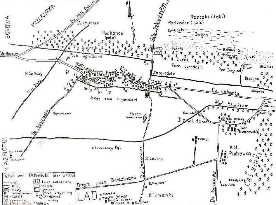 WYKAZ GOSPODARSTW w około 1939r. Na podstawie książki L.Popka „Cmentarz parafialny w Ostrówkach na Wołyniu” i książki „Wołyński Testament” w opracowaniu L.Popka, T.Trusiuka, P. i Z. Wira. Wykaz sporządzili: Tomasz Trusiuk i Czesław Kuwałek. Numer kolejny odpowiada numerowi gospodarstwa na planie. W cudzysłów ujęto przezwiska osób lub rodzin, które w codziennym życiu funkcjonowały na równi z nazwiskami. 1 | MUZYKA | Agnieszka 1893 z d. Szwed, dzieci: Regina +1943, Zofia, Stanisław. | 2 | TRUSIUK | Piotr „Piotruś”, żona Łucja (24 lata), dzieci: Marianna (9 lat), Helena (5 lat), (IN) (3 lata). Zamordowani 30.08.1943. | 3 | TRUSIUK | Mikołaj „Mikuś”, żona Anastazja, dzieci: Helena, Jan, Zofia. Zamordowani 30.08.1943. | 4 | TRUSIUK | Łukasz „Pilip” (52 lata), żona Apolonia (50 lat), dzieci: Feliks (19 lat), Aleksander (16 lat), Agnieszka (14 lat). Zamordowani 30.08.1943. | 5 | TRUSIUK | Antoni „Pilip” (70 lat), syn (IN) (40 lat), synowa (IN) (38 lat), 2-je wnuków (10 lat, 8 lat). Zamordowani 30.08.1943. | 6 | SUSZKO | Marianna, wdowa po Wincentym +1931, dzieci: Karolina 1920 (w Woli Ostrowieckiej), syn Józef 1924-1943 (roztrzaskali mu głowę), Czesław 1927, bliźnięta Zofia (po m.Kieruj) i Antoni 1929. Po wojnie: Królikowo. (wspomnienia) | 7 | GRACZ | Julian “Marcinek” (syn Andrzeja?) | 8 | GRACZ | Jan 1893-30.08.1943 - s. Piotra i Franciszki z d. Hajdamczuk, “Ślepy Marcinków” (ociemniały). | | GRACZ | Stanisław 1923-1943 - s. Jana, żona Longina 1924-1943 z d. Palec, w ciąży. | 9 | WASIUK | Stefan “Gołaskie” (50 lat), żona Jadwiga (43 lata), dzieci: Feliks (15 lat), Helena (10 lat), Marianna (7 lat). Zamordowani 30.08.1943. | 10 | WASIUK | Stanisław „Gołaskie” (40 lat), żona Helena (35 lat), dzieci: Józef (5 lat), Janina (2lata), Czesław (ocalał). Zamordowani 30.08.1943. | 11 | TRUSIUK | Aleksander „Jarosz Król”, żona Karolina (50 lat), dzieci: Marianna (13 lat), Katarzyna (12 lat), Józefa (10 lat). | 12 | TRUSIUK | Łukasz „Jarosz Cesarz” (65 lat), żona Maria (43 lata). Zamordowani 30.08.1943. | 13 | TRUSIUK | Stefan „Beja” (30 lat), żona Józefa (30 lat), dzieci: Maria (15 lat). Zamordowani 30.08.1943. | 14 | TRUSIUK | Piotr „Pilip” (50 lat), żona Marianna (47 lat), dzieci: Łukasz (ułan) (24lata), Antoni (22lata), Zofia (17 lat). Zamordowani 30.08.1943. | 15 | GIEC | Marcelina (40 lat), dzieci: Jan (14 lat), Stanisław (10 lat),.Łucja, Jadwiga. 30.08.1943 zamordowano Stanisława i Jana. | | DĄBROWA | Józef, żona Karolina +1943 z d. Łysiak, dzieci: Emilia 1935-1943, Stanisław 1938-1943. | A | BLAT | Michał, żona Stanisława (30 lat) z d. Drzymała, nauczycielka, syn Cezary (8 lat). Zamordowani 30.08.1943. | | RYBCZYŃSKI | Jan. | B | RADOŃ | Jan (36 lat) (organista, organistówka), żona Karolina (35 lat). Zamordowani 30.08.1943. | | KUWAŁEK | Aleksander, żona Marianna, dzieci: Janina, syn. | C | DOBRZAŃSKI | Stanisław (plebania, ksiądz) (39 lat). Zamordowany 30.08.1943r. - odrąbano mu głowę. | | CZABAN | Antoni, żona Maria Zofia (36 lat) z d. Adamowicz (nauczycielka) -zamordowana 30.08.1943. | | NIZIUK | Jan Lucjan (40 lat) (były urzędnik gminy), żona Lucyna, dzieci: Anna, Tadeusz, (IN). Zamordowani 30.08.1943. | | JURKIEWICZ | Maciej (76 lat) (były organista), żona Waleria (68 lat). Zamordowani 30.08.1943. | 16 | KLOC | Józef | | KLOC | Tomasz (48 lat), żona Marianna (41 lat), dzieci: Jadwiga (20 lat), Aleksander (18 lat), Wiktoria (17 lat). Zamordowani 30.08.1943. | 17 | DĄBROWA | Aleksander (50 lat), żona Ewa (50 lat) z d. Pradun, dzieci: Ewa (27 lat), Jan (18 lat). Zamordowani 30.08.1943. | 18 | DĄBROWA | Paweł, żona Ewa (35 lat), dzieci: Jan (17 lat), (IN) (9 lat). Zamordowani 30.08.1943. | 19 | WASIUK | Piotr | 20 | KLOC | Łukasz, żona Franciszka (45 lat), dzieci: Zofia (16 lat), Katarzyna (8 lat). Zamordowani 30.08.1943. | 21 | KLOC | Ignacy | 22 | KLOC | Karol | 23 | KLOC | Józef | 24 | TRUSIUK | Jan “Ilki” | 25 | TRUSIUK | Łukasz, żona (IN), dzieci: 2-je. Zamordowani 30.08.1943. | 26 | SZWED | Ignacy | 27 | MUZYKA | Wojciech, syn (IN), synowa (IN), 2-je wnuków. Zamordowani 30.08.1943. | 28 | PRADUN | Łukasz (64 lata) s. Józefa, żona (IN), dzieci: Zofia (24 lata). Zamordowani 30.08.1943. | 29 | KOZIKOWSKI | Łukasz (50 lat), żona Anna (47 lat), dzieci: Maria, Stanisław, 3-je. Zamordowani 30.08.1943. | 30 | KOZIKOWSKI | Stefan (55 lat), żona (IN) (50 lat), dzieci: 4-ro. Zamordowani 30.08.1943. | 31 | KOZIKOWSKI | Szczepan (72 lata), żona (IN) (70 lat), dzieci: Józef (poniżej), (IN) (30 lat). Zamordowani 30.08.1943 | | KOZIKOWSKI | Józef (45 lat) s. Szczepana, żona (IN) (40 lat), dzieci: 2-je. Zamordowani 30.08.1943. | 32 | PRADUN | Antoni (57 lat), żona Anastazja z d. Łysiak, dzieci: Stanisław (17 lat), Maria (5 lat). Zamordowani 30.08.1943. | | PRADUN | Jan, dzieci: Łukasz. Zamordowani 30.08.1943. | 33 | MUZYKA | Stanisław, dzieci: (IN). Zamordowani 30.08.1943. | 34 | PRADUN | Grzegorz, żona Maria? Zamordowani 30.08.1943. | 35 | PRADUN | Jan, żona (IN), dzieci: 2-je. Zamordowani 30.08.1943. | 36 | PRADUN | Łukasz (64 lata), żona Anastazja (56 lat) z d. Łysiak. Zamordowani 30.08.1943. | 37 | MUZYKA | Józef, żona Anastazja, dzieci: Kazimierz, Katarzyna, Leokadia, Wiktoria. Zamordowani 30.08.1943. | | ŁYSIAK | Jan, żona Anastazja (26 lat) z d. Kawałek, dzieci: Edward (4 lata), Ryszard (2 lata) Zamordowani 30.08.1943. | 38 | KUWAŁEK | Aleksander. Syn Henryk (10 lat) zamordowany 30.08.1943. | | KUWAŁEK | Józef (58 lat) s. Władysława, żona Dorota (40 lat), dzieci: Edward (17 lat), Władysław (12 lat). Zamordowani 30.08.1943. | | KUWAŁEK | Tadeusz | 39 | KLOC | Łukasz (45 lat), żona (IN), dzieci: Wiktoria (21 lat), Zofia (17 lat), Feliks (15 lat), Helena (12 lat). Zamordowani 30.08.1943. | 40 | PALEC | Łukasz (60 lat). Zamordowany 30.08.1943. | 41 | ŁYSIAK | Jan, żona Agnieszka, dzieci: Maria, Zofia,