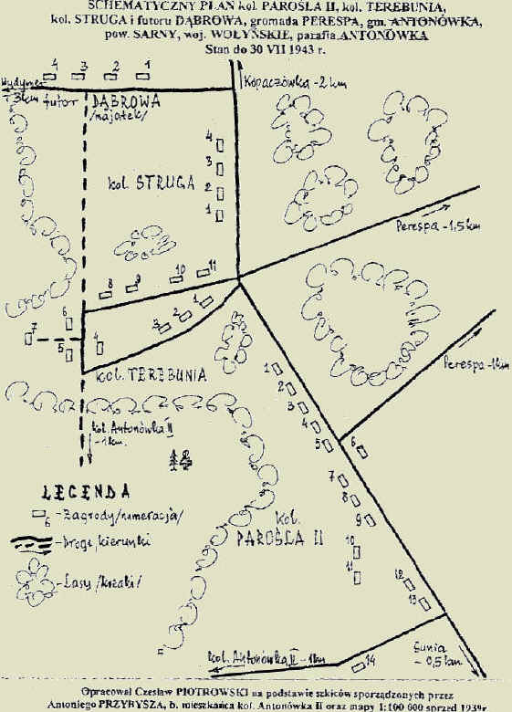 (ujęci w wykazie Antonówki) | 6. | BRZOZOWSKI | Jan 1899-1943 - s. Michała i Ewy z d. Chorażyczewska, żona Rozalia 1909 z d. Woźniak, dzieci: Stanisław 1933, Ludwika 1937, Eugeniusz 1940, Kazimierz 1943-1943. Jana razem z "młodym Turowskim" w dniu 17 lutego 1943 porwali "banderowcy" i obu zamordowali. Rozalia z dziećmi została wywieziona na roboty do Niemiec. Po wojnie mieszkała w Olszynie i we Wrocławiu. | 7. | BIELAWSKI | Jan, żona Magdalena, dzieci: Maria, Stefania, Leon, Kazimierz, Mieczysław. | 8. | TUROWSKI | Andrzej, żona Rozalia, dzieci: Jan z żoną Kalistą i synkiem Andrzejem; Ludwik, Henryk. | 9. | RUDNICKA | Klementyna - wdowa, dzieci: Regina, Jan, Ludwik. | 10. | BOROWSKI | Albin, żona Helena, dzieci: Rafał i Elżbieta. | 11. | BIELECKI | Kamil 1901-1987, żona Antonina 1904-1989, dzieci: 1 córka w wieku szkolnym. Po wojnie w Legnicy. | 12. | BIELECKI | Marcin 1908-1987, żona Maria 1918-1992, dzieci: Zofia, Zbigniew. Po wojnie w Legnicy. | 13. | SERAFIN | Bolesław, żona Maria, dzieci: Józef, Scholastyka, Helena. Po wojnie w Legnicy. | 14. | PIETROŁAJ | Stanisław 1902-1963 (*Stepań) - s. Jana (s.Józefa i Aleksandry z d. Łozowicka) i Emilii z d. Dziekańska, rymarz, żona Józefa 1900-1988 (*Sunia) z d. Oczeretko - c. Jana i Urszuli z d. Rudnicka, krawcowa, dzieci: Władysław (zmarł w Niemczech w lagrach), Janina 1930, bliźniacy Wacław 1933-1997 i Edmund 1933-2001, Teresa 1936. Mieszkali w części zwanej "ZANOWINY". Po wojnie w Legnicy. V.n.: Piotrowski. Siostra Stanisława - Aniela mieszkała w Ladach (Fokin). Bracia Józefy ojca to Edward (w Sunii) i Józef | | OCZERETKO | Wanda 1926 i Jerzy 1926-1936 (1937 ?, utopił się w Horyniu). Przysposobione bliźniaki - dzieci Józefy. | | 15. | ŚLIWIŃSKI | Leon - s. IN. i Marceli z d. Oczeretko, żona Stefania z d. Czarnecka. Po wojnie w Legnicy. | Brak więcej informacji. Proszę Państwa o pomoc w uzupełnianiu wykazu. Poz. 1-14 opubl. przez Cz. Piotrowskiego przygotowane 11.02.1998 r. na podst. relacji Romana Tubicz Burzyńskiego (w Legnicy). | | L.p. |   | Informacje |   | 1. | Beata Brzozowska | c. Eugeniusza. [sierpień 2010] korekta i uzup. w poz. 6. Fakty znam z opowiadań i posiadanych dokumentów. ZDJĘCIA przedwojenne. | beata.brzozowska(a)op.pl | 2. | Krystyna Paszkiewicz Tubicz | [styczeń 2009] uzup. poz. 3. (z przeniesienia z wykazu Parośli I) | kapliczka(a)amorki.pl | 3. | Arek Tubicz | wnuk Mieczysława. [kwiecień 2014] korekta w poz. 1. | arektubicz(a)gmail.com | 4. | Grażyna Śniegórska | wnuczka Stanisława. [luty 2016] poz. 15, korekta i uzup. w poz. 14. | grazyna.sniegorska16(a)o2.pl | 5. | Bogumiła Hałas | [październik 2017] uzup. poz. 15. Bardzo proszę o jakiekolwiek informacje dotyczące ich rodzin. | bogusia0412(a)gmail.com |