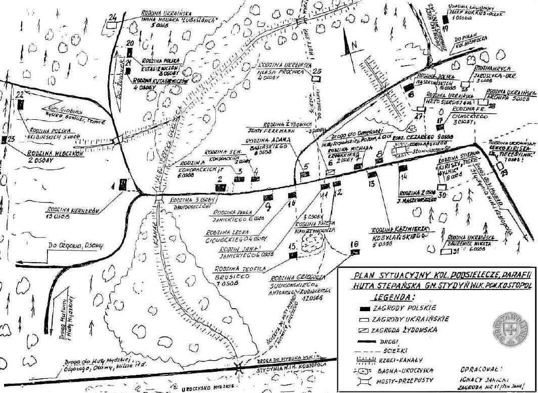 WYKAZ GOSPODARSTW, stan z około 1939 r. (poz.1-23 z publikacji Cz. Piotrowskiego) | 1. | WERNER | Bogumił (Gotlib) - s. Karola i Anny z d. Szpryngel, żona (śl.1911) Julianna z d. Fornalczyk, dzieci: Marian, Stanisław, Józef, Stefan, Zofia +2016 (Dębowiecka), Antoni - wywieziony na roboty do Niemiec, gdzie zginął w czasie bombardowania. Rodzina była muzykalna, prawie wszyscy grali na instrumentach. W 1943r. wywiezieni na roboty do Niemiec. Po wojnie na ziemiach zachodnich Polski. | | WERNER | Marian - s. Bogumiła i Julii, żona Janina, dzieci: Stanisław i Ireneusz. | | WERNER | Stanisław - s. Bogumiła i Julii, żona Helena. | | WERNER | Józef - s. Bogumiła i Julii, żona Janina z d. Wodara z Huta Mydzkiej, syn Roman. | | 2. | DAWIDOWICZ | Antonina z d. Kobylańska, wdowa po Piotrze, dzieci: Mikołaj 1918 - zaginął na wojnie, Stanisław 1922 - po wojnie Stare Kolnie k.Opola, Władysław 1926 - obecnie Orzeszków k.Wołowa | | 3. | KONOPACKI | Władysław - s. Antoniego i Marii z d. Kamińska, żona Anastazja z d. Maszkowska - córka Pawła i Franciszki z d. Sulikowska, dzieci: Maria (m.Stanisław Dębowicki z Ożgowa), Józef, Jan, Stanisław, Janina. Wywiezieni na roboty do Niemiec, po wojnie w Ulesiu k/Legnicy. Siostra Anastazji - Józefa mieszkała w Wyrobkach. | | 4. | KONOPACKI | Antoni 1876-17.07.1943 - s. Piotra i Anieli z d. Sulikowska, żona Maria +17.07.1943 z d. Kamińska. Małżeństwo bestialsko zamordowane. Dzieci: Emilia, Władysław. | | 5. | BASIŃSKI | Adam - s. Jana, do 1939 r. był sołtysem, żona Stanisława z d. Konopacka - c. Adama i Pauliny z d. Maszkowska, dzieci: Henryk, Paulina | | 6. | FEREMAN | Jema, żona Jenta, 5 dzieci w tym syn Berko. Rodz. żydowska. Mieli sklep. | | 7. | KROWICKI | Michał 1888-18.07.1943, wdowiec z wnuczkiem Zdzisławem 1930-18.07.1943. | | 8. | KOBYLAŃSKI | Cezary 1903-1943 - s. Hipolita, szewc, żona Malwina 1907-1943, dzieci: Katarzyna 1932 (Zawadzka), Stefania, Jan, Marcin i Teresa. Mieszkał z nimi dziadek Hipolit 1873. | | 9. | JANICKI | Paweł 1897 - s. Walentego i Tekli z d. Maszkowska (c.Antoniego 1837-1929 i Józefy 1840 z d. Brusiło), żona Weronika 1898 z d. Maszkowska - c. Adama i Józefy z d. Kopij, dzieci: Zygmunt, Tadeusz, Józef i Lucyna. Po wojnie osiedli w Pszczynie. Rodzeństwo Pawła to: Jan (p.11), Stanisława (Cichocka w Ladach), Paulina (Chorążyczewska w Wilczem). Maria (po I m. Wodara, po II m. Oziębłowska, w Hucie Mydzkiej), Teofila (po m. Sulikowska). | | 10. | CICHOCKI | - mieszkali w Polanach | | 11. | JANICKI | Jan - s. Walentego i Tekli z d. Maszkowska, żona Władysława z d. Maszkowska - c. Pawła i Franciszki z d. Sulikowska; synowie Stanisław, Adam, Ignacy (autor szkicu), córka Danuta. W marcu 1943 rodzina przeniosła się do Wyrki, gdzie przeżyła napad ukraiński i została wywieziona do Niemiec. Po wojnie zamieszkali pod Rawiczem, potem w Bydgoskiem. Siostra Władysławy - Józefa mieszkała w Wyrobkach. | | 12. | WAWRZYNOWICZ | Józef - s. Jana i Anastazji z d. Burzyńskiej, żona Józefa z d. Janicka - c. Jana i Władysławy (poz.11), dzieci: córka Aniela. W marcu 1943 roku ewakuowali się do rodziny w Wyrce. | | 13. | KOBYLAŃSKI | Kazimierz - s. Hipolita, żona Anna z d. Dąbrowska (z Mutwicy?), dzieci. | | 14. | MASZKOWSKI | Józef - s. Pawła (s.Augustyna i Antoniny z Drzewieckich) i Franciszki z d. Sulikowska, żona Helena z d. Chorążyczewska. Bezdzietni, mieszkali z ojcem Józefa. Siostry Józefa to: Malwina (Dawidowicz, mieszkała w Mutwicy), Józefa (Kołodyńska, w Wyrobkach), Rozalia Antonina (Żołędziewska, zmarła w Nieruczu), Anastazja (Konopacka - w poz. 3) i Władysława (Janicka - w poz. 11) | | 15. | BRUSIŁO | Teofil - s. Jana i Kamili z d. Wysocka, żona (śl.1914) Feliksa z d. Konopacka - c. Adama, dzieci. Teofil miał braci: Józef (ż.Helena Kołodyńska, śl.1895) i Zygmunt (ż.Narcyza Kobylańska, śl.1901) oraz siostrę Adelę (Bielawska, w Ladach). | | 16. | SULIKOWSKI | Grzegorz +1943, żona Anastazja 1895-1943, dzieci: Paulina (Rudnicka, poniżej), Stanisław +1944, Józefa 1927-1943, Józef 1929-1943, Marceli 1931-1943, Malwina 1936-1943, Janina 1940-1943, Danuta 1942-1943. Mieszkała tu matka Grzegorza - Honorata. Stanisław został wywieziony na roboty do Niemiec, gdzie zginął w czasie bombardowania. | | RUDNICKI | Antoni 1915-1943, żona Paulina 1918-1943 z d. Sulkowska, synek Czesław 1940-1943. | | 17. | CICHOCKI | - mieszkali w Mydzku | | 18. | MASZKOWSKA | - mieszkali w Polanach | | 19. | KORKUS | Józef, osadnik-legionista, w stanie kawalerskim. Brat Aleksander w Omelance. | | 20. | KUTASIEWICZ | Kamila, wdowa, dzieci: Petronela i Stefan. | | 21. | KUTASIEWICZ | Gerwazy - s. Kamili, żona Józefa z d. Brusiłło, dzieci. | | 22. | SKIBIŃSKI | Franciszek, żona Helena, dzieci. | | 23. | WŁÓCZKO | Włodzimierz - gajowy, żona Helena. W 1940 r. zabrani przez sowietów na Sybir. | | 24. | KONOPACKI | Adam 1868-1943 - s. Piotra i Anieli z d. Sulikowska, żona (śl.1894) Paulina z d. Maszkowska, dzieci: Stanisława, Teofila | | 25. | KONOPACKI | Adam 1906 - s. Józefa, żona Genowefa 1915 (z d. Kobylańska?) - c. Hipolita, dzieci: Aniela 1930, Romualda 1932, Jan 1934, Janina 1936, Izabela 1938. Zabrani na Sybir. | Brak więcej informacji. Proszę Państwa o pomoc w uzupełnianiu wykazu. Objaśnienie: 1943 (rok w barwie niebieskiej) - wymordowani przez banderowców (większość w dniach 16-20.07.1943 r.). |