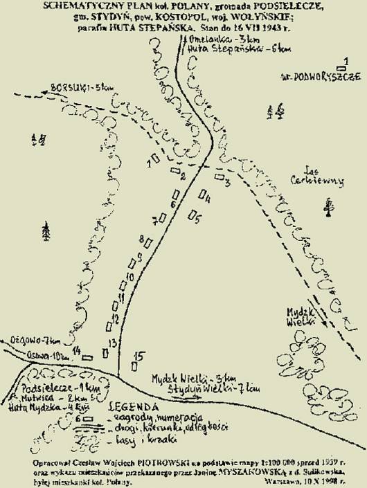 Projekt WYKAZU GOSPODARSTW, stan w około 1939 r. (w poz. 1-15 na podst. oprac. Cz. Piotrowskiego) 1. | KORKUŚ | Józef, stary kawaler, legionista. | 2. | KORKUŚ | Antonina, wdowa po Franciszku, dzieci: Wiktor (tu zmarł), Genowefa (w Klesowie), Leontyna (Dziekańska, w Wyrce). | 3. | KORKUŚ | Stanisław, żona Emilia z d. Felner, 2 dzieci. | 4. | HOROSZKIEWICZ | Marian, żona Malwina, dzieci: Janina. | 5. | SUCHARSKI | Stanisław, żona Antonina z d. Sulikowska - c. Piotra i Marianny Dawidowicz, dzieci: Stefan 1935 i Maria 1937. | 6. | CICHOCKI | Leon, żona Stanisława z d. Brusiło - c. Teofila, 3 dzieci. Leon był komendantem Strzelców. | 7. | KOPIJ | Józef, żona Genowefa z d. Kobylańska, 5 dzieci. | 8. | WAWRZYNOWICZ | Cezary, żona Maria z d. Kobylańska, 3 dzieci. | 9. | SULIKOWSKI | Marian, żona Marianna z d. Sucharska, dzieci: Romualda 1932, Tadeusz 1934, Mirosław 1936, Wacław 1939, Danuta 1941. | 10. | SULIKOWSKA | Marianna z d. Dawidowicz, wdowa po Piotrze - s. Franciszka i Filipiny z d. Żołędziewska, dzieci: Antonina (Sucharska, w poz. 5). Stanisław 1920-4.05.1943, Janina (Myszakowska), Emilian 1927 (wywieziony na roboty do Niemiec, zaginął bez wieści). | 11. | TEREBYLNIK | Paweł, żona, 2 dzieci. Rodz. ukr. | 12. | SULIKOWSKA | Józefa, syn Henryk. | 13. | MASZKOWSKI | Marek 1908, żona Albina z d. Kotecka z Ilnika, dzieci: Irena, Mieczysław, Danuta, Lilia. | 14. | MASZKOWSKA | Paulina 1888 z d. Dawidowicz, wdowa po Anastazym 1880-1930 - s. Antoniego i Józefy z d. Brusiło, (Anastazy miał brata Józefa, który poślubił Emilię Dawidowicz), dzieci: Maria 1900 (po m. Cichocka), Mikołaj 1904, Marek (w poz. 13), Józef 1910, Jan 1911, Bronisław 1915 (w poz. 15), Władysława 1918 (po m. Bober), Janina 1922, Stanisława 1928 | 15. | MASZKOWSKI | Bronisław - s. Anastazego i Pauliny, żona Janina z d. Bober z Wilczy, dzieci: Józef (w Kol. Stydyńskiej), Mikołaj (w Hutwinie), Władysława (Bober, w Niesześci). | 16. | JAROSIK | Grzegorz, żona Warka, dzieci: Semen. Posiadał sklep spożywczy w którym wszystko można było kupić | | | | Uroczysko PODWORYSZCZE (poz. 1 na podst. oprac. Cz. Piotrowskiego) | | 1. | KONOPACKA | IN., wdowa po Pawle, synowie: Antoni, Józef, Piotr, Marceli, Alojzy. | Proszę Państwa o pomoc w uzupełnianiu wykazu. |
