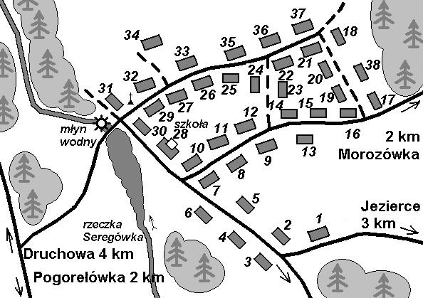 z rodziną | 25. | KURIATA | Dominik - s. Józefa i Krystyny z d. Żygadło, żona Olimpia z d. Bagińska, dzieci: Franciszek, Józef, Rozalia, Tomasz. | 26. | KURIATA | Stanisław, żona, syn Józef 1940. | 27. | KURIATA | Tomasz z rodziną, syn Jan 1941 lub Józef 1941. | 28. | KURIATA | Paweł z rodziną. W tym budynku mieściła się 4-klasowa szkoła podstawowa | 29. | KURIATA | Dionizy - s. Dominika i Antoniny z d. Mrozowska, żona Adela 1885 (*Szczekiczyn) z d. Żygadło - c. Franciszka i Elżbiety z d. Wysocka. | 30. | RAKOWSKI | Hipolit - s. Jana i Pauliny z d. Boczkowska, żona Wiktoria z d. Kuriata; córki: Leontyna, Teofila i Elżbieta | 31. | MIELNIK | Paweł (właściciel młyna wodnego) - rodzina ukraińska | 32. | IWAŃCZUK | Petro - rodzina ukraińska | 33. | IWAŃCZUK | Stepan - rodzina ukraińska | 34. | IWAŃCZUK | Wasilij - rodzina ukraińska | 35. | BAYER | IN., stolarz, wyjechał do Rzeszy w 1940 r. Rodz. niemiecka. | 36. | EMMA | IN., krawiec, wyjechał do Rzeszy w 1940 r. Rodz. niemiecka. | 37. | nn | Fedor. Rodzina ukraińska. | 38. | KURIATA | Józef z rodziną | | Nieoznaczeni na szkicu: | 39. | KURIATA | Marceli 1910 - s. Ksawerego i Pauliny z d. Lech, żona Wincentyna 1920 z d. Kamińska - c. Antoniego i Władysławy z d. Bronowicka, dzieci: Ryszard. Po wojnie w Szymanowicach koło Wrocławia. | 40. | MALIGRANDA | Łucjan 1900 - s. Dominika i Kamili z d. Płomińska, żona Aleksandra 1909 - c. Hipolita i Heleny z d. Kirkiewicz, dzieci: Helena, Anna, Genowefa, Ryszard, Jadwiga 1940, Krystyna 1942-1943, Tadeusz 1944. Dwaj bracia Łucjana zostali zamordowani przez bandy "UPA" w drodze na odpust św. Jana. Pochowani zostali przy dużej mogile w Jeziercach. Siostra Aleksandry - Anna Bzowska z mężem została zamordowana we własnym domu. Dwoje ich dzieci o imionach: (Krystyna?) i Edmund wyjechali z Wołynia z dziadkami: Hipolitem i Heleną. Łucjan wraz z żoną Aleksandrą po wojnie osiedleni w miejscowości Stróża w województwie dolnośląskim. | 41. | LISIECKI | Franciszek (leśniczy) - s. Mikołaja i Anieli z d. Targoni, żona