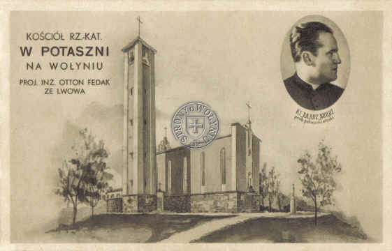 Pocztówka-cegiełka z wizerunkiem budowanego wówczas kościoła p.w. św. Józefa Oblubieńca NMP, według projektu inżyniera Ottona Fedaka ze Lwowa. Obok wizerunek ówczesnego proboszcza ks. Juliusza Janusza. Pocztówka wydrukowano w Rotograwurze w Poznaniu, Drukarni św. Wojciecha. Własność - Jadwiga Piotrowicz z d. Lech, skan przysłał Krzysztof Kołwzan.