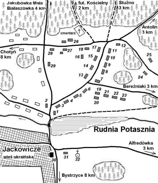 WYKAZ GOSPODARSTW, stan w około 1939 r. | 1. | KURIATA | Roman - s. Hipolita i Kamili (z d. Boczkowska?), żona Paulina z d. Lisiecka; córki: Leontyna, Zofia, Teresa, syn Stanisław 15.05.1925 (na przymusowych robotach w Niemczech 1942-1945). | | 2. | OSTROWSKI | Franciszek, żona Zofia z d. Zenty. Do 1939 r. miał sklep wielobranżowy. | | 3. | GERSZMAN | Wolf, żona Etka, dz: Jankiel, Izaak. Gerszman był właścicielem młyna. Prowadził również sklep (rodzina została zamordowana w 1939 r.). Dawniej w Potaszni mieszkał również inny żyd: HERSZKO IN, żona Ruchla, dz: Awulo. Herszko także prowadził sklep. | | 4. | LECH | Hieronim - s. Kazimierza i Marianny z d. Bagińska, wdowiec (I żona Anna Litke), II żona Józefa z d. Bronowicka, wdowa po Bagińskim; synowie: Marian, Piotr i Bronisław; córki: Janina i Teofila. | | 5. | ROGULA | Stefan, żona Marcelina z d. Szachniewicz, dzieci: Mieczysław, Irena, Stanisław, Henryka, Jadwiga. Stefan prowadził sklep spożywczy w domu. Mieszkańcy Potaszni przekręcali nazwisko na Rogalski. Rodzina wyjechała jako jedna z pierwszych, ostrzeżona przez Ukraińca, że są pierwsi do zamordowania. | | 6. | MACIUSZKIEWICZ | Feliks, żona Antonina z d. Maksymowicz - c. Ignacego z Rudni Łęczyńskiej; synowie: Franciszek, Stanisław i Piotr (był w partyzantce radzieckiej, został zamordowany przez Ukraińców w 1943 r. będąc na przepustce w domu); córki: Bronisław, Józefa, Zofia i Florentyna (była wywieziona w 1943 r. na roboty do Niemiec). Maciuszkiewicze przenieśli się do miejsc. Kilianów koło Kątów Wrocławskich i po wojnie zostało przekręcone nazwisko na Matuśkiewicz. | | 7. | RUDNICKI | Władysław, żona Janina, córka Janina. | | 8. | DAWIDOWICZ | Wincenty, żona Tekla; synowie: Kazimierz, Adam i Stanisław; córki: Władysława i Leontyna. | | 9. | DAWIDOWICZ | Andrzej, żona Nadieżda (Ukrainka); synowie: Arkadiusz i Leon; córki: Danuta i Leokadia | | 10. | DAWIDOWICZ | Faustyn z rodziną. (Faustyn został zamordowany przez Ukraińców w sierpniu 1943 r.) | | 11. | DAWIDOWICZ | Dionizy 1897-25.05.1943 (ciężko zraniony przez Ukraińców, zmarł), Rodzina IN. | | 12. | BAGIŃSKI | Fabian, żona Adela; synowie: Franciszek, Grzegorz, Jan +1942 i Gracjan; córka Anastazja. | | 13. | KURIATA | Walenty - s. Pawła i Agnieszki z d. Kuriata, żona Marcelina z d. Kuriata; synowie; Zygmunt (wcielony do Armii Czerwonej) i Paweł (był w oddziale AK ,,Bomby"-,,Wujka", zginął 21 grudnia 1943 r. w Zawołoczu z rąk NKWD, w ochronie dowódcy oddziału). | | 14. | KLEPUSZEWSKI | Tomasz, żona Michalina: córka IN | | 15. | KLEPUSZEWSKI | Bronisław, żona Adela; córki: Małgorzata, Janina i Stefania; synowie Jan i Paweł. Po wojnie Adela wraz z dziećmi osiedliła się w Sulistrowicach na Dolnym Śląsku. | | 16. | KLEPUSZEWSKA | Aniela z d. Kondracka, wdowa po Bolesławie - s. Pawła i Tekli z d. Kuriata, synowie: Leon, Tomasz i Jan. | | 17. | KURIATA | Fabian - s. Pawła i Agnieszki z Kuriatów, żona Teofila z d. Kuriata (oboje zmarli w Potaszni). Dom ten nazywano ,,Domem sierot". W tej rodzinie było 8 dzieci: dwóch synów Felicjan i Witold - zginęli w okolicach Zgorzelca w 1945 r. już po wojnie, syn Adam, córki: Franciszka (po mężu Lisiecka), Aniela (po mężu Roznerska), Marcelina (po mężu Kondracka) - żona sołtysa w Bereźniakach, Józefa (po mężu Jasińska) i Adela (po mężu Falkowska). | | 18. | KURIATA | Władysław - s. Grzegorza, żona Teofilia z d. Kalityńska; córki: Helena, Antonina i Genowefa; synowie: Jan i Grzegorz. | | 19. | LECH | Adam, żona Marianna z d. Sztandara - c. Juliana i Franciszki, dzieci Marianny z I małż z Dionizym Kuriatą: Genowefa (wywieziona na przymusowe roboty do Niemiec), Stanisław, Aleksandra, Józef (zmarł w dzieciństwie) oraz z tego małżeństwa Jadwiga, Aleksander. (uwaga: usytuowanie domu niepewne) | | 20. | LECH | Bolesław 1902 - s. Adama i Klary (p.21), żona Regina 1903 z d. Lech - c. Adolfa i Julii z d. Węgłowska, dzieci: Julia 1932, Genowefa 1936, Teresa 1939, Bernarda 1940. Po wojnie zam.w okolicach Szczecina. | | 21. | LECH | Adam - s. Kazimierza i Marianny z d. Bagińska, żona Klara z d. Bagińska, dzieci: Bolesław (p.20), Mateusz, Ignacy, Czesław (poniżej), Michalina, Marcelina, Feliksa, Paulina, Rozalia. | | LECH | Czesław 18.08.1910, żona Honorata 27.11.1909 z d. Lech - c. Adolfa 1880 i Antoniny 1883 z d. Hanuszkiewicz (a w księgach Januszkiewicz), dzieci: Stanisława 1936, Stefan 1939, Zehela. Po wojnie Jaksonów k/ Wrocławia. | | RĘKACZ | Władysław, żona Antonina z d. Hanuszkiewicz, dzieci: Leokadia 1927. Być może mieszkali w Bereźniakach. Po wojnie Jaksonów. Pierwszy mąż Antoniny (śl.1907) - Adollf Lech to syn Józefa i Agnieszki z d. Lech. Był podwójnym wdowcem, przed Antoniną były: Julia Węgłowska (śl.1899) i Karolina Marcinkowska (śl.1906). Adolf poległ w I wojnie światowej. | | 22. | MICHNIEWICZ | IN z rodziną; losy nieznane. W rodzinie była Teofila, która wyszła za Stanisława Lecha (w Bereźniakach). | | 23. | MICHNIEWICZ | IN z rodziną; losy nieznane. | | 24. | KURIATA | Wiktor, żona Teofila; córka Leontyna i syn Edward | | 25. | HOŁUBOWICZ | IN, żona IN - oboje zmarli w Potaszni. W domu tym mieszkało liczne osierocone rodzeństwo, w tym głuchoniema córka, przygarnięta przez rodzinę Hieronima Kuriaty z Bereźniaków | | 26. | WAWRUN | Josel (przezwisko ,,Juzwa") - właściciel młyna, żona Ryfka, dwoje dzieci i rodzice Josela. Żydowska rodzina wymordowana 1943 r. przez Ukraińców; ,,Juzwa" ciężko ranny ocalał. | | 27. | FALKOWSKI | Adam 26 l. z rodziną. Adam był kowalem, został zamordowany przez Ukraińców w sierpniu 1943 r | | 28. | FALKOWSKI | Edward, żona Marcelina; synowie: Dominik i Jan, córka Maria. Cała rodzina zamordowana w sierpniu 1943 r. przez Ukraińców. | | 29. | ŻYGADŁO | IN, żona IN - małżeństwo w podeszłym wieku, spaleni żywcem przez Ukraińców w październik