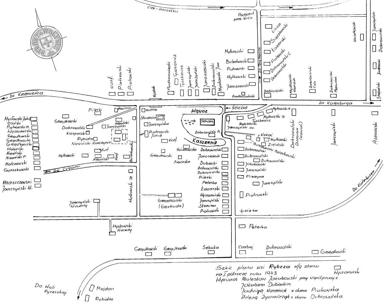 (źródło) | | 78. | JANCZYŃSKI | Jan, żona Konstancja, dzieci: Maria, Józef, Jadwiga, Wacław - Niemcy zabrali i zginął. | | 79. | ŁAZARSKA | Domicela z d. Ludkiewicz z Piszczatyńc, wdowa po Kazimierzu +4.03.1922, dzieci: Wiktor (w poz. 69), Jan (poniżej), Antoni (w poz. 70), Leon 1916-18.09.1944 (poległ na wojnie), Maria 8.09.1918 (Jakubowska, w poz.55). | | ŁAZARSKI | Jan +2003, żona (śl.1939) Rozalia 1920 z d. Najbar z Woli Rycerskiej, synowie: Stanisław 1940-1943, Zdzisio 1943-1943. | | 80. | PETERKO | Franciszek, I żona Konstancja, dzieci: Jan, Władysława, Józef. | | PETERKO | Jan, żona Romana z d. Grządkowska. Sąsiadami byli Góralscy (poz.95). Po wojnie: w Służejowie, woj wrocławskie. | | 81. | MYTKOWSKI | Leon, żona IN, dzieci: Wiktor. | | 82. | MYSŁOWSKI | Marcin +1943, sołtys, żona Maria, dzieci: Kazimierz. Marcin został zamordowany wraz z Franciszkiem Mytkowskim i Janem Niwińskim, który podwoził ich do gminy. | | 83. | NIEWIŃSKI | Piotr, żona Stanisława, dzieci: Piotr. | | 84. | JAROSZEWSKI | Tomasz 1877 - s. Wincentego i Antoniny z d. Korf, żona (śl.1904) Karolina 31.12.1886 z d. Jaroszewska - c. Polikarpa 1860-1890 i Józefy z d. Czuwińska. | | 85. | JAROSZEWSKI | IN, żona Agnieszka, dzieci: Bronisław, Jan (w Starej Mikołajówce), Piotr, Franciszek, Feliksa, Józef. | | 86. | WYSZOMIRSKI | Wincenty, I żona Anna z d. Gajewska, dzieci: Petronela, Maria, Paweł; II żona Sabina, dzieci: Antonina, Feliksa. | | 87. | WYSZOMIRSKI | Jan, żona Ludwika, dzieci: Józef, Stanisław, Feliks, Piotr, Zygmunt. | | 88. | POŻYNY | Czylin, żona Rozalia, dzieci: Konstancja, Maria, Franciszka, Marcel, Józef. Rodzina czeska. | | 89. | DOBROWOLSKI | Jan, żona Helena, dzieci: Dominik, Anna (m.Stanisław Socha - Staszyców), Franciszka, Antoni. | | 90. | DOBROWOLSKI | Edward, żona Sabina z d. Woźnicka, dzieci: Jan 20.10.1904, Maria, Franciszka, Stanisław 20.04.1922, Kazimierz. | | 91. | DOBROWOLSKI | Piotr, żona Maria, dzieci: Anna, Jan, Bronisław, Zofia Po wojnie osiedlili się wraz z Zofią, Anną (po mężu Korf) i Janem w Mąkoszycach, woj.opolskie, natomiast Bronisław odnalazł się dopiero w latach 60-tych. Mieszkał w USA. | | 92. | DOBROWOLSKI | Aleksander - s. Piotra i Karoliny z d. Zawistowska, żona Rozalia z d. Grządkowska - c. Grzegorza i Elżbiety z d. Popławska, dzieci: Karolina, Józefa. | | 93. | DOBROWOLSKA | Wiktoria, wdowa po Konstantym - s. Antoniego 1863-12.04.1933, dzieci: Janina, Emilia 11.04.1913 (m.Stanisław Mytkowski z poz.32), Marcel, Romka. | | 94. | KOWALSKI | Józef, żona, syn Bolesław 9.12.1922. | | 95. | GÓRALSKI | Marian, żona Rozalia z d. Jampolska, dzieci: Bolesław 22.05.1929 i jeszcze 4-ro (wśród nich był chłopiec oraz dziewczynka o rudych włosach). Zajmowali się handlem końmi. Wszyscy oprócz Bolesława zostali zabici. Po wojnie Bolesław zamieszkał w Służejowie, woj wrocławskie razem z sąsiadami - rodziną Peterko (poz.80). | | 96. | LISICA | Piotr 1900, żona Emilia 1900 z d. Piotrowska - c. Jakuba i Petroneli (poz.53), dzieci: Zygmunt 1923, Eugeniusz 1930, Jadwiga 1925, urodzeni w Rybczy, po wojnie osiadli w Anglii. | | 97. | MYTKOWSKI | Konstanty, żona Maria 1903 z d. Piotrowska - c. Jakuba i Petroneli (poz.53), syn Zdzisław 1933. Po wojnie w Chojnowie. | | 98. | BACIOROWSKI | Antoni - s. Kajetana i Karoliny z d. Walarowska, żona Anna 1905-1943 ( zamordowana i spalona przez banderowców) z d. Piotrowska - c. Jakuba i Petroneli (poz.53), dzieci: Mirosława 1938, Henryk 1940. Dzieci po wojnie mieszkali we Wrocławiu. | | 99. | PIOTROWSKI | Józef 8.12.1908-27.04.1945 (poległ na wojnie) - s. Jakuba i Petroneli (poz.53), żona Maria z d. Jeleńkowska ( I mąż Hrycak), dzieci: Zygmunt 1933, Wanda 1935, Edward 1939. | | HRYCAK | Rozalia - c. IN. i Marii z d. Jeleńkowska. | | 100. | MYTKOWSKI | Franciszek 9.10.1903-9.04.1944 (dowódca samoobrony Rybczy) - s. Jana i Antoniny z d. Korf, żona Maria 2.02.1906-1996 z d. Korf, synowie: Eugeniusz 30.07.1930-2000, Jan 11.01.1933-2009 (+Chojnów). Po wojnie w Jerzmanowicach k/ Chojnowa. | | 101. | nn | Icko, rodzina żydowska, sklep spożywczy. | Brak więcej informacji. Proszę Państwa o pomoc w uzupełnianiu wykazu. Objaśnienie: rok w barwie: niebieskiej - śmierć z rąk bandytów ukraińskich (w tym tzw. "upa"). Uwagi: * (gwiazdka) oznacza że w pierwotnym spisie nie podano imion i jest to przyporządkowanie domyślne dla rodziny o tym nazwisku, informacje uzupełniające zostały zaczerpnięte z Wykazu osób..., ks. Żurek, ewentualnie przekazane przez niżej wymienione osoby. ? - nie wiadomo dokładnie w którym domu rodzina mieszkała. |
