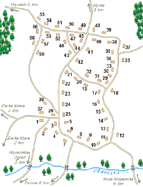 Wykaz ustalony przez Romana Piotrowskiego i Władysławę Piotrowską Onuchowską z Wyrki, opracowany łącznie ze szkicem przez Czesława Piotrowskiego w 1997 r. i przetworzony elektronicznie przeze mnie na podstawie pracy "Zniszczone i zapomniane osiedla Polskie ...".