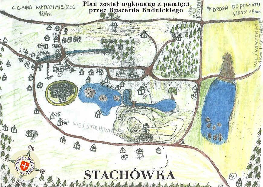 | 1. | ANDRZEJEWSKI | Józef, żona Anna z d. Oczkowska (Oczeretko), syn Jan 1941. | | 2. | BARADZIEJ | Stanisław 1900 (*Sosnowiec Śląski), żona Marcelina z d. Bułgajewska, wdowa po Rudnickim (synowie poniżej), dzieci: Kazimierz, Wincenty i Mirosława (po wojnie w Gryfinie). Stanisław zaciągnął się bardzo wcześnie do Legionów Płsudskiego, po wojnie jako osadnik wojskowy trafił do Stachówki. Pełnił tutaj funkcję komendanta i instruktora Związku Strzeleckiego. Marcelina miała brata Zygmunta. | | RUDNICKI | Synowie Marceliny: Eugeniusz i Bolesław. Eugeniusz wstąpił do partyzantki i służył pod Kunickim, kiedy ten zaczął współpracować z Sowietami, potem przeszedł do oddziału im. T. Kościuszki, którym dowodził pułkownik Robert Satanowski (późniejszy generał brygady, a w cywilu dyrygent). Oddział ten liczył (w różnych okresach) 2500-3000 żołnierzy. W 1943 roku Eugeniusz jadąc na zwiad (na klaczy imieniem Baśka, będąca koniem swojego dowódcy) wjechał na minę przeciwczołgową. Został ciężko ranny, z pola minowego na płachcie wyciągnęli go sowieccy żołnierze. Dochodził do zdrowia 8 miesięcy w sowieckim szpitalu. Do końca wojny nie powrócił do służby. Wielokrotnie odznaczany, m.in.: Orderem Polonia Restituta, Krzyżem na Polu Chwały (Waleczny), Krzyżem Partyzanckim i kilkoma medalami. Kazimierz mając 17 lat wstąpił do Armii Polskiej i przeszedł szlag bojowy od Lenino do Berlina. Po pogromie rodzina wraz z resztą mieszkańców została wywieziona do Niemiec. Odnaleźli się na ziemiach odzyskanych, w miejscowości Parsów, pow. Pyrzyce. | | 3. | LEBIEDZIEJEWSKI | I.N., dzieci: Ludwika (Kubsik), Cezary +2009, Zofia (Gutowicz, poniżej). Stachówkę opuścili w końcu czerwca 1943 r. przemieszczając się wozami ciągnionymi przez konie, najpierw do Suni, a potem do Antonówki. Częściowo byli eskortowani przez Niemieckich żołnierzy. Ktoś z Suni i Antonówki potem poinformował ich, iż widział dym i palące się domy Stachówki. W Niemczech osiedlili się najpierw w okolicy Norymbergii (Nurnberg) i czekali tam parę tygodni zanim pracodawcy ich zabrali do siebie. Po wojnie zamieszkali w Detroit, M.I., oprócz Zofii. | | GUTOWICZ | Jan, żona Zofia +2004 z d. Lebiedziejewska, dzieci: Barbara 1941. Po wojnie w Chałubkach koło Paczkowa. | | 4. | FELIŃSKI | I.N. Po wojnie mieszkał we Wrocławiu. | | 5. | RUDNICKI | Cylian - s. Józefa, żona Onyszka z d. Gułaj - Ukrainka z Jeziora, córki: Janina, Danusia i Zosia. Cylian znany był z grania na skrzypcach (uczył gry m.in. sąsiada - Juliana Andrzejewskiego); posiadał strzelbę i chodził na polowania z bratem Aleksandrem oraz ze Szcześniewskim, a także z Kempą (nauczycielem). Był lubiany przez młodzież. Razem z Aleksandrem posiadali sporej wielkości sad z jabłoniami (3 różne gatunki), orzechem, gruszami i śliwami. Janina, najstarsza z córek zmarła jeszcze w Stachówce, Cylian również. Danusia i Zosia najpierw, podobnie jak wiele innych Stachówkowiczów, wyjechały do pracy w Niemczech, a potem wróciły do Polski i osiedliły się w Jeleniej Górze. | | RUDNICKI | Aleksander - s. Józefa, żona Ewa z d. Kozłowska, dzieci: Gienia, Halina, Stanisława 1938-1998, Józef, Kazimierz ~1930 (nazywany wtedy też Bernard, Boniusio). Aleksander i Ewa przez część lat mieszkali w tym samym domu z Cylianem i jego rodziną. | | 6. | RUDNICKI | Edward ~1862 - s. Alojzego, I żona Stefania z d. Turowska, dzieci: Genowefa, Stanisław, Marianna; II żona Maria z d. Turowska (siostra Stefanii), dzieci: Józef, Zofia 1925, Jan, Jadwiga, Michał, Ryszard (z żoną Kazimierą), Józefa, Kazimierz +1.05.1945 (zginął w Niemczech - wpadł pod transporter amerykański), Bolesław +1943 (zamordowany niedaleko wsi Jarynówka) i Weronika. Edward i jego brat mieszkali o trzy domy od Aleksandra i Cyliana Rudnickich po tej samej stronie drogi nieopodal stachówkowego jeziorka. W latach trzydziestych sprzedali swój sad dwóm Żydom, którzy prawdopodobnie na stałe mieszkali w innej miejscowości, a na tym terenie postawili sobie szopę, w której się zatrzymywali. Ok. r. 1936 jesienią, po zbiorze owoców, synek Mariana i córeczka Edwarda Rudnickich (Weronika) znieśli tuż obok tej szopy kukurydzę i rozpalili na niej ogień, po czym schowali się w środku (tej samej szopy lub stojącej obok budy?). Ogień się rozniósł i dzieci padły śmiertelną ofiarą pożaru. | | 7. | RUDNICKI | Marian - s. Alojzego, miał córkę Wandę. Razem z bratem Edwardem latem 1943 r. wyjechali do Niemiec, w 1946r. wrócili do Polski, ożenili się oraz osiedlili w okolicy Wrocławia. | | 8. | WEINER | IN., Żyd, właściciel okolicznych lasów (od Osowy po Kanonicze). W Stachówce mieszkała też inna rodzina żydowska, która posiadała tu sklepik. | | 9. | BAGIŃSKI | Piotr +7.05.1981 (w Bydgoszczy) - s. Dominika i Anastazji z Miszkiewiczów, żona IN., zmarła w Stachówce. Dzieci z pierwszego małżeństwa: Eleonora, Irena (+) i Janusz (+). Piotr był wywieziony na Syberię, skąd wydostał się z Armią Andersa. Walczył pod Monte Casino, w Afryce, potem przedostał się do Londynu. Po wojnie osiedlił się w Jeżowie Sudeckim, a potem w Dziwiszowie k. Jeleniej Góry, gdzie mieszkali krewni oraz sąsiedzi ze Stachówki. W Dziwiszowie też spotkał Józefę Andrzejewską (córkę Franciszka i Franciszki Woźniak), wdowę po Zygmuncie (najpierw ranny z rąk ekstremistów ukraińskich, umarł w Stachówce na tyfus). | | 10. | ANDRZEJEWSKI | Józef 1885-05.1943 - s. Sylwestra i Antoniny, żona Michalina 3.02.1893-3.07.1957 (+Górczyna, Dln. Śl.) z d. Bułgajewska - c. Jana i Anieli, dzieci: Felicja (poniżej), Bolesław 25.04.1919-1940? (zaginął w marcu lub kwietniu po wcieleniu do wojska sowieckiego, przysłał list do rodziny i potem nie było z nim kontaktu), Zofia 28.04.1923-4.04.2010 (+Wschowa, woj.lubuskie, Wacław Pirzecki (poz. 11) był jej chłopakiem, po wojnie mężem); Bron