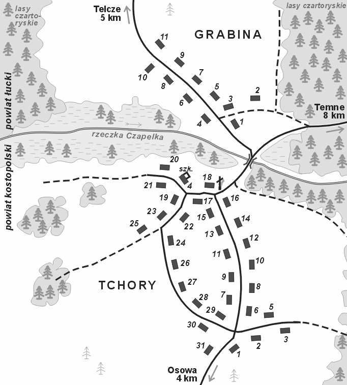 Kol. Tchory położona na drugim brzegu rzeczki Czapelki w stosunku do kolonii Grabina i była powiązana z tą kolonią (wspólna szkoła w Tchorach), z targami w Osowie (gm. Stydyń) i z parafią w Hucie Stepańskiej. WYKAZ GOSPODARSTW, stan w około 1939r. (najdalej do 1943 r.) | 1. | SKARŻYŃSKI | Mieczysław, żona Katarzyna z