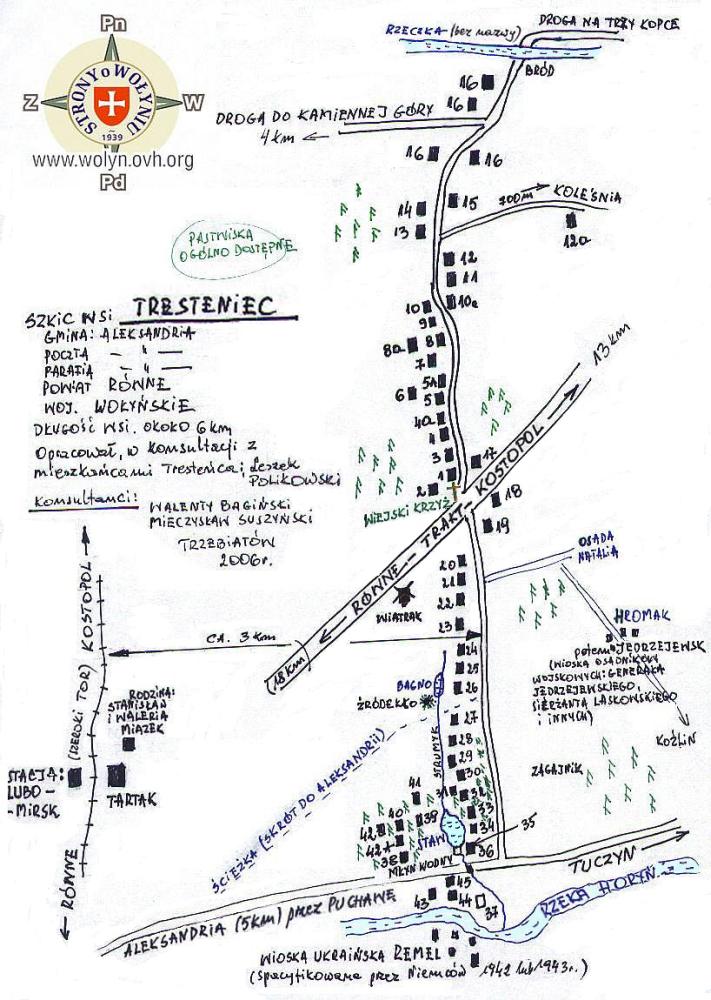 Wioska została spalona przez nacjonalistów ukraińskich w nocy z 1 na 2 sierpnia (niedziela – poniedziałek) 1943 roku. Oto krótki fragment wspomnień świadka tych zdarzeń członka wiejskiego oddziału samoobrony Walentego Bagińskiego (fragment z książki pt „ Tresteniec – ocalić od zapomnienia”) „ ... my ze swoimi jednostrzałowymi karabinami byliśmy po prostu – jak to teraz oceniam - szaleńcami. Wokół po wioskach paliły się domostwa Polaków, w końcu w nocy z 1 na 2 sierpnia banderowcy rozpoczęli z bezpiecznej odległości ostrzał kulami zapalającymi. W ten sposób rozpoczęła się likwidacja naszej rodzinnej wioski. Wokół pełno ognia, ryk i jęk przerażonych zwierząt. Staraliśmy się konie wygnać ze stajni, lecz te przerażone tuliły się biedne do ścian i tak boleśnie czekały na swoją straszliwą śmierć w płomieniach” --- NOTATKI (informacje, które gdyby były pełniejsze, mogłyby uzupełnić wykaz) Jadwiga Żarczyńska, imię ojca: Stanisław, data urodzenia: 28-07-1936/22-07-1936 r., miejsce urodzenia: Tresteniec pow. Równe (źródło) Edmund Sawicki, imię ojca: Stanisław, data urodzenia: 01-11-1926 r., miejsce urodzenia: Tresteniec (źródło)