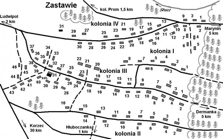 Według legendy przekazywanej przez mieszkańców Zastawia, osiedle to powstało w II połowie XIX w., kiedy po odbyciu kary zesłania na Sybir, za udział w Powstaniu Listopadowym, grupa powracających Polaków została tam przymusowo ,,zostawiona" z nakazem pozostania tylko na tym terenie, bez prawa powrotu do rodzinnych stron. Pochodzili oni wszyscy z tzw. Kongresówki (Polski centralnej), stąd też szukali kontaktów z rodzinnymi stronami, sprowadzali swoich bliskich i znajomych, żenili się z polskimi pannami z Zasłucza, zakładali i rozbudowywali swoje gospodarstwa wśród lasów na lewym brzegu Słuczy w pobliżu Ludwipola. W rezultacie powstały cztery liczne kolonie, stanowiące Zastawie, które do 1939 r. było gromadą łącznie z kol. Głuboczanka i kol. Józefówka w gminie Ludwipol. Ze względu na różnorodność pochodzenia mieszkańców w Zastawiu spotykało się mowę polską z wieloma narzeczami różnych regionów Polski. Była tam nowo zbudowana szkoła, gdzie uczyli bardzo patriotyczni nauczyciele, m.in. małżeństwo Wąsowiczów ze Lwowa, poświęcający wiele uwagi organizacji harcerskiej wśród młodzieży. Działał tam liczny Związek Strzelecki z komendantem Józefem Staniszewskim, Katolickie Stowarzyszenie Młodzieży Żeńskiej i Męskiej, Koło Gospodyń Wiejskich i inne organizacje społeczne. | WYKAZ GOSPODARSTW, stan w około 1939 r. (najdalej do 29 czerwca 1943 r.) | | KOLONIA I | | 1. | PAKUŁA | IN., dzieci? IN. | | 2. | TKACZ | Paweł - s. Jana i Agaty z d. Bogoda, żona (śl.1918) Franciszka z d. Richter, dzieci? IN. | | 3. | ZAJĘCKI | Konstanty - s. Stanisława i Marianny z d. Stępień, żona (śl.1898) Julianna z d. Kowalczyk, dzieci? IN. Zamordowani przez Ukraińców w napadzie 29.06.1943 r. | | 4. | KULIŃSKI | IN. z rodziną IN. | | 5. | JADOWSKI | Marek +17.02.1939 - s. Wojciecha i Rozalii z d. Łoboda, żona (śl.1897) Teofila +29.06.1943 z d. Kulińska/Kula, dzieci Wacław 1915-1990, Antoni +1970, Józef (w Kol. II, poz.13), Leokadia 1910-1992 (Murawska, zob.niżej). | | MURAWSKI | Roman 1904-1996 (*Granne) - s. Adama z Głuboczanki (i Bronisławy z d. Chodakowska?), żona Leokadia z d. Jadowska, dzieci: Wanda 1929-1941 (+w szpitalu w Syzrań, Rosja), Alina 1934, Leonard 22.07.1940-1994 (*Archagielsk). Zabrani na Sybir, po wojnie Mieszkowice, woj. zach-pom. | | 6. | STĘPNIAK | IN. z rodziną IN. | | 7. | WAWRZEŁA | ? Józef, żona IN., dzieci: Jan Władysław 1942, Kazimierz 1943. V.n.: Wawrzeło. | | 8. | RYCHTER | IN. z rodziną | | 9. | BOCZKOWSKI | Antoni 1887-1943 (wypadek w kuźni) - s. Władysława i Tekli z d. Łukaszewicz z Niewiarkowa, żona (śl.1918) Marianna 1895-06.1943 (zamordowana, ciało spalone w domu) z d. Arabas/Arabarz - c. Jana i Apoloni z d. Olejniczak, dzieci: Władysław 1921-1995, Zofia 1924-1993, Antonina 1928-2004, Bronisława 1930 (po m.Bocian), Marian 1937. Po wojnie: Trzcianka Lubuska. Była tu kuźnia i olejarnia. Dzieci przetrwały napad ukraiński w schronie wybudowanym przez Antoniego. | | KOLONIA II | | 1. | RESIAK | Józef 1890 - s. Michała i Józefy z d. Mróz, z rodziną - 7 osób IN. |