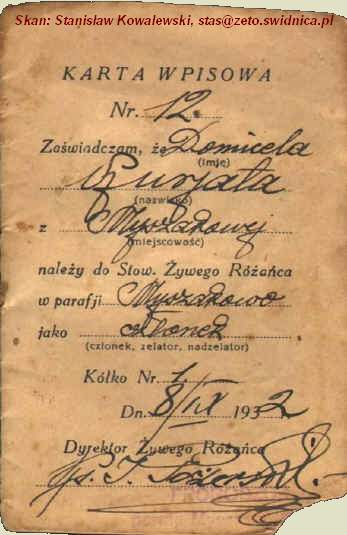 | - Karta wpisowa Domiceli Kuriatowej do Stowarzyszenia Żywego Różańca w parafii Myszakowa.