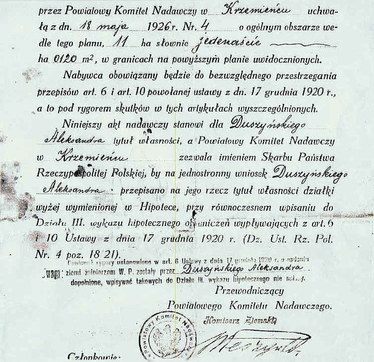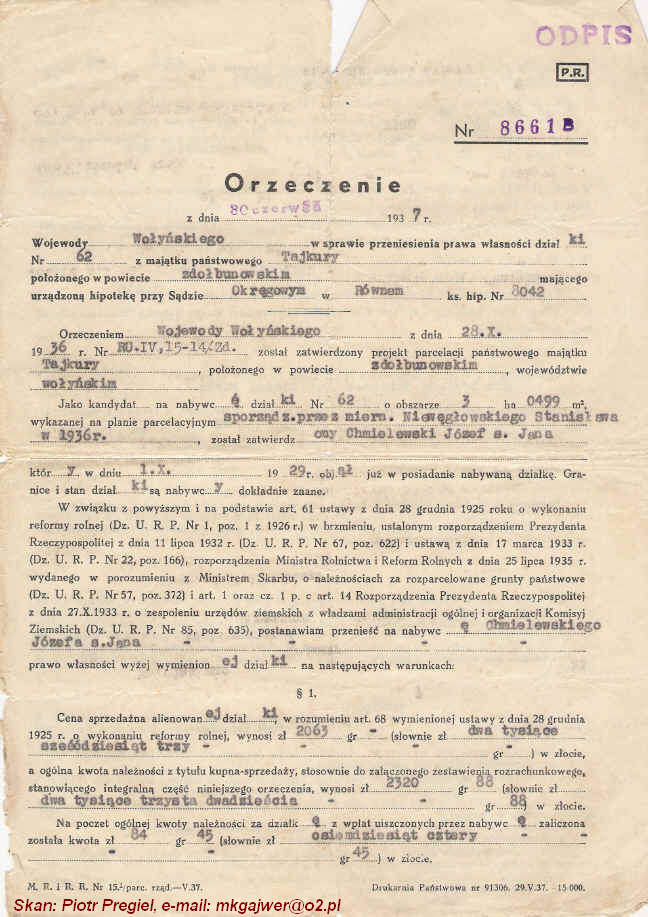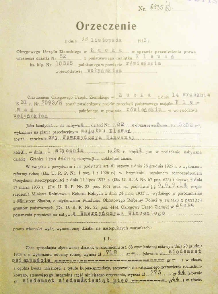 | Orzeczenie Wojewody Wołyńskiego w sprawie przeniesienia prawa własności działki. | ||