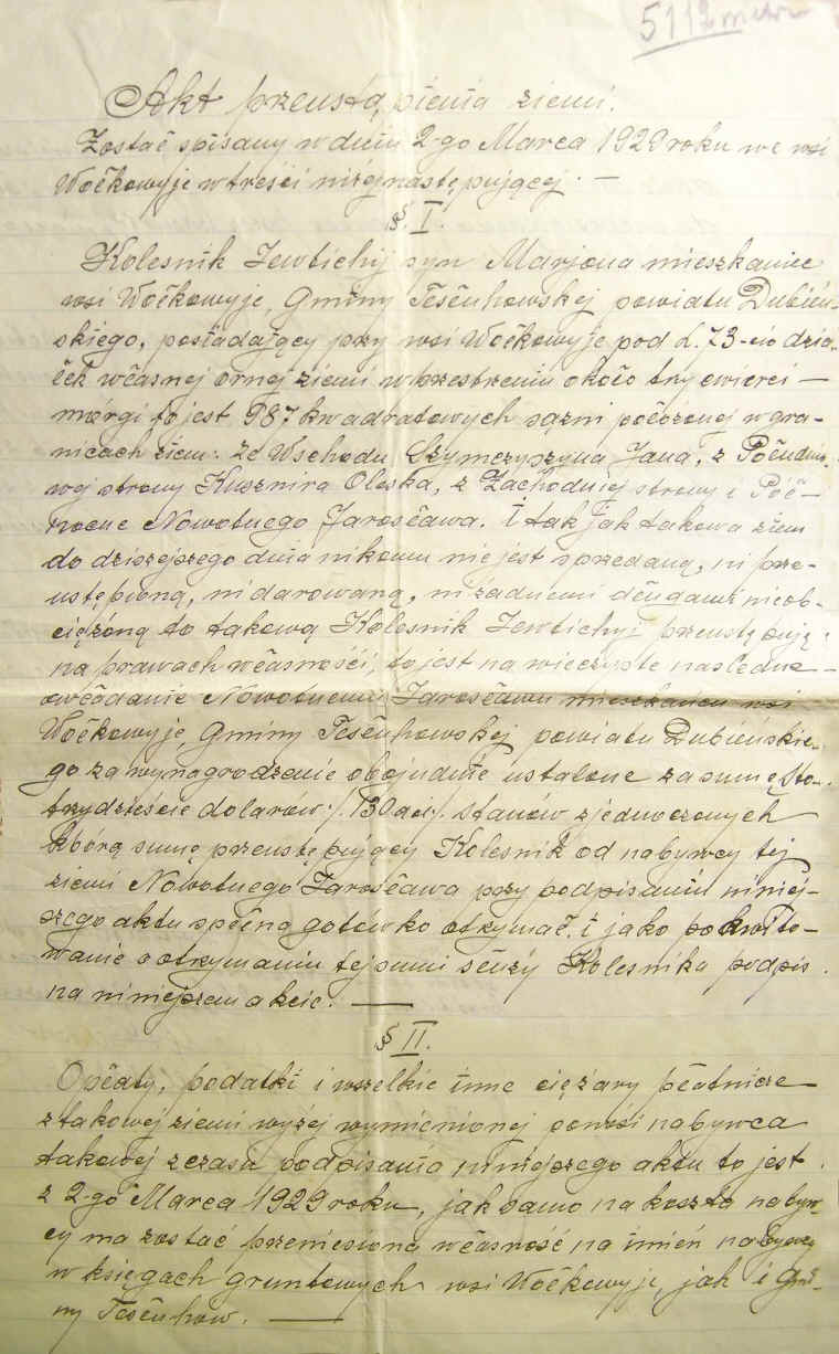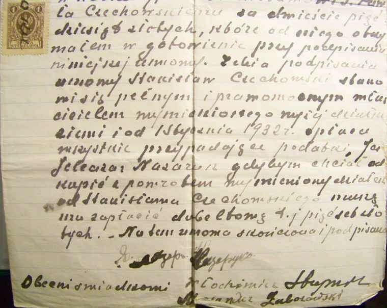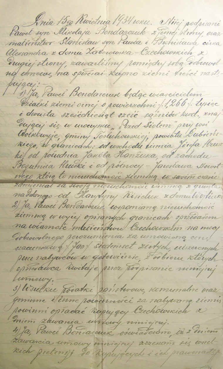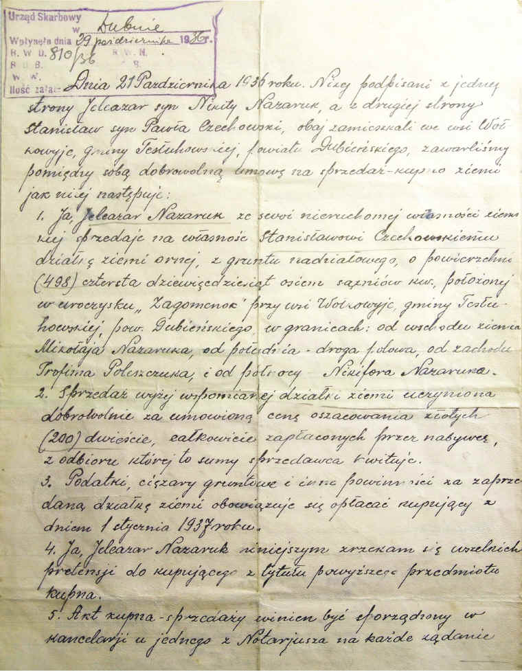 | Umowa sprzedaży-kupna ziemi pomiędzy Jelcazarem Nazarukiem i Stanisławem Czechowskim.