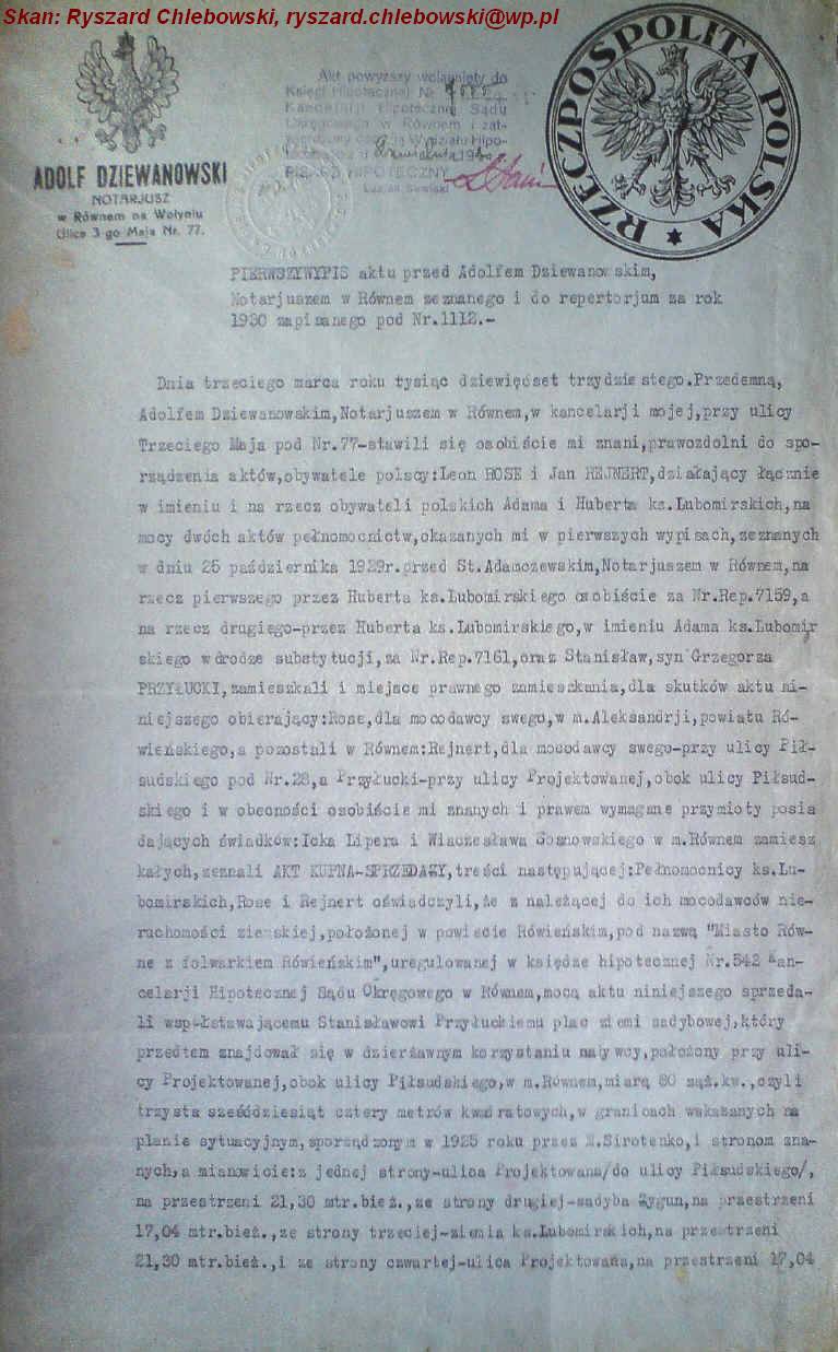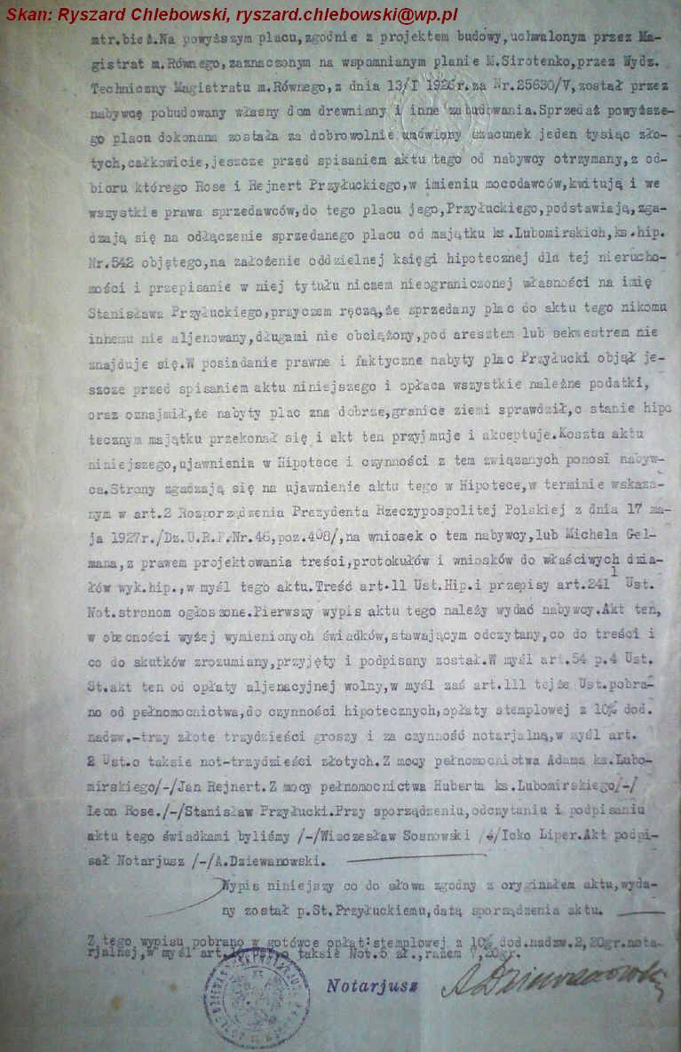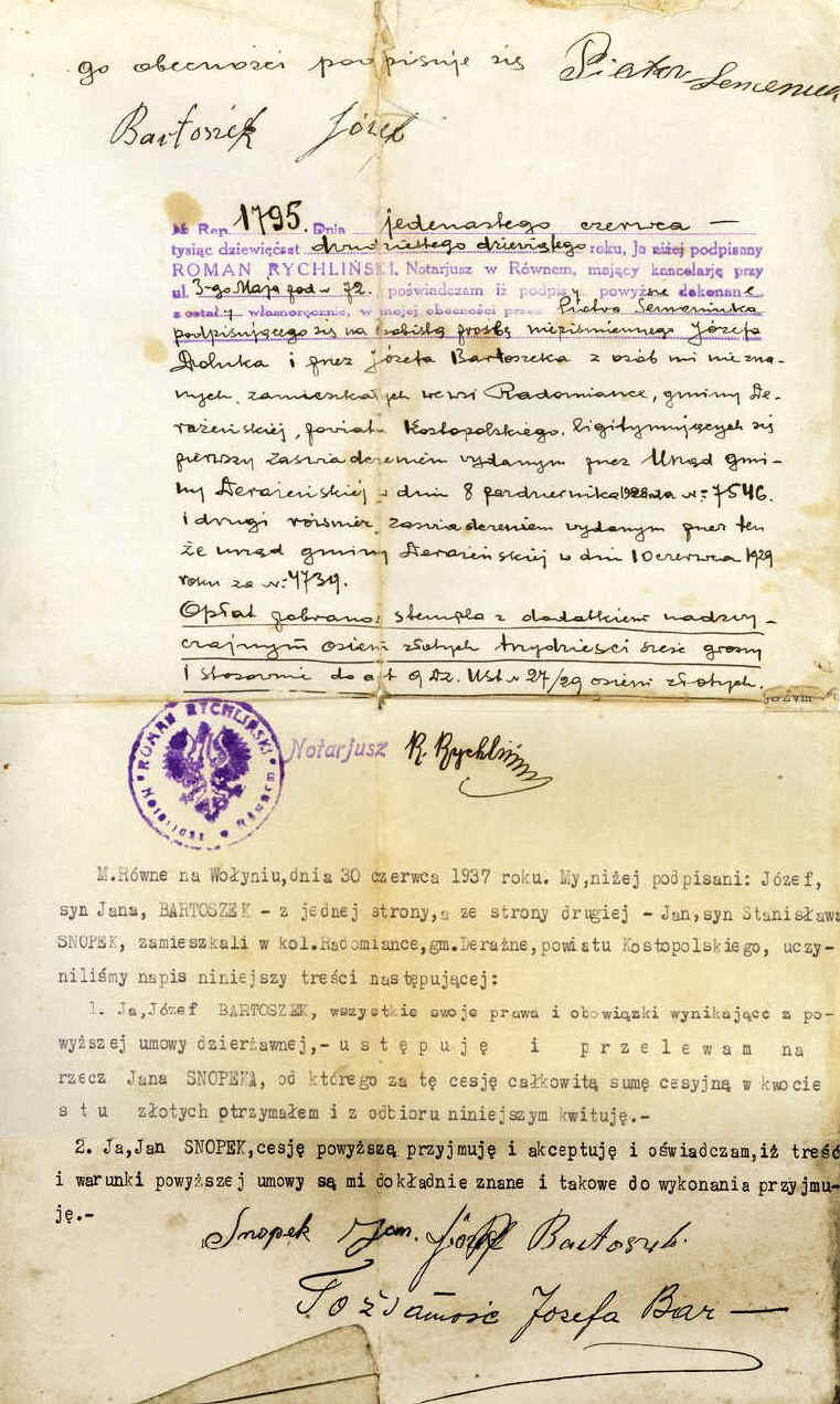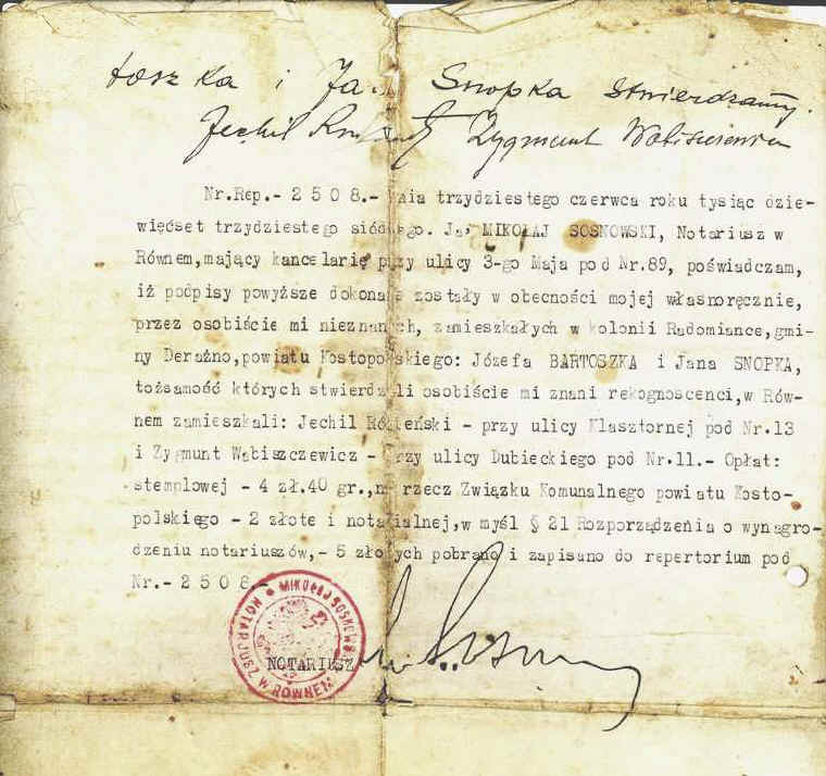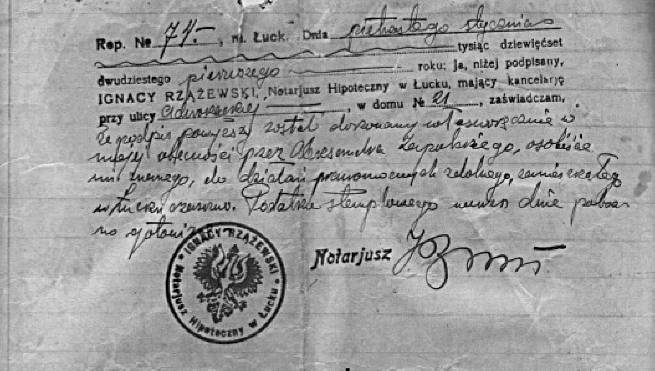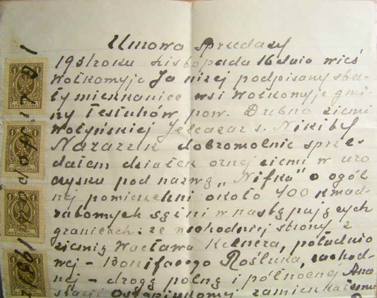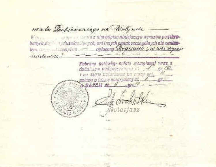 | Fragment aktu notarialnego zakupu ziemi w Kopaczówce sporządzonego u notariusza w Łucku. | ||