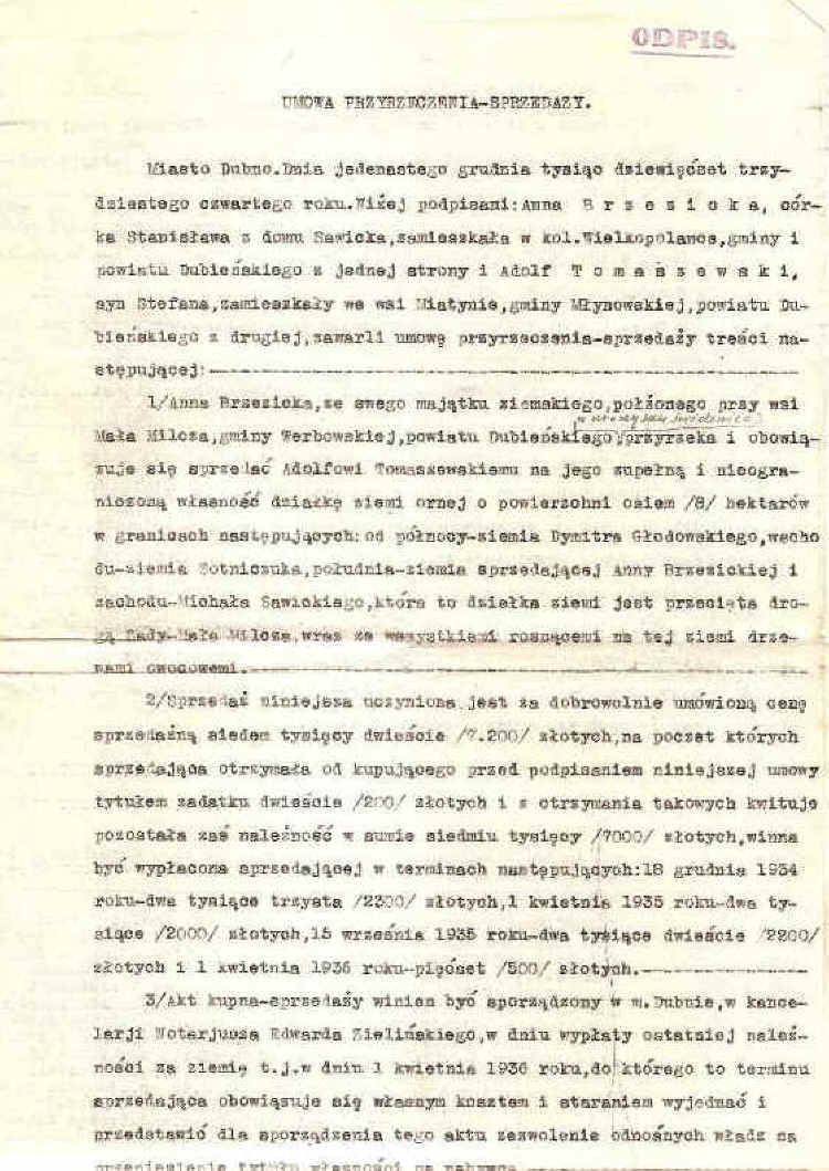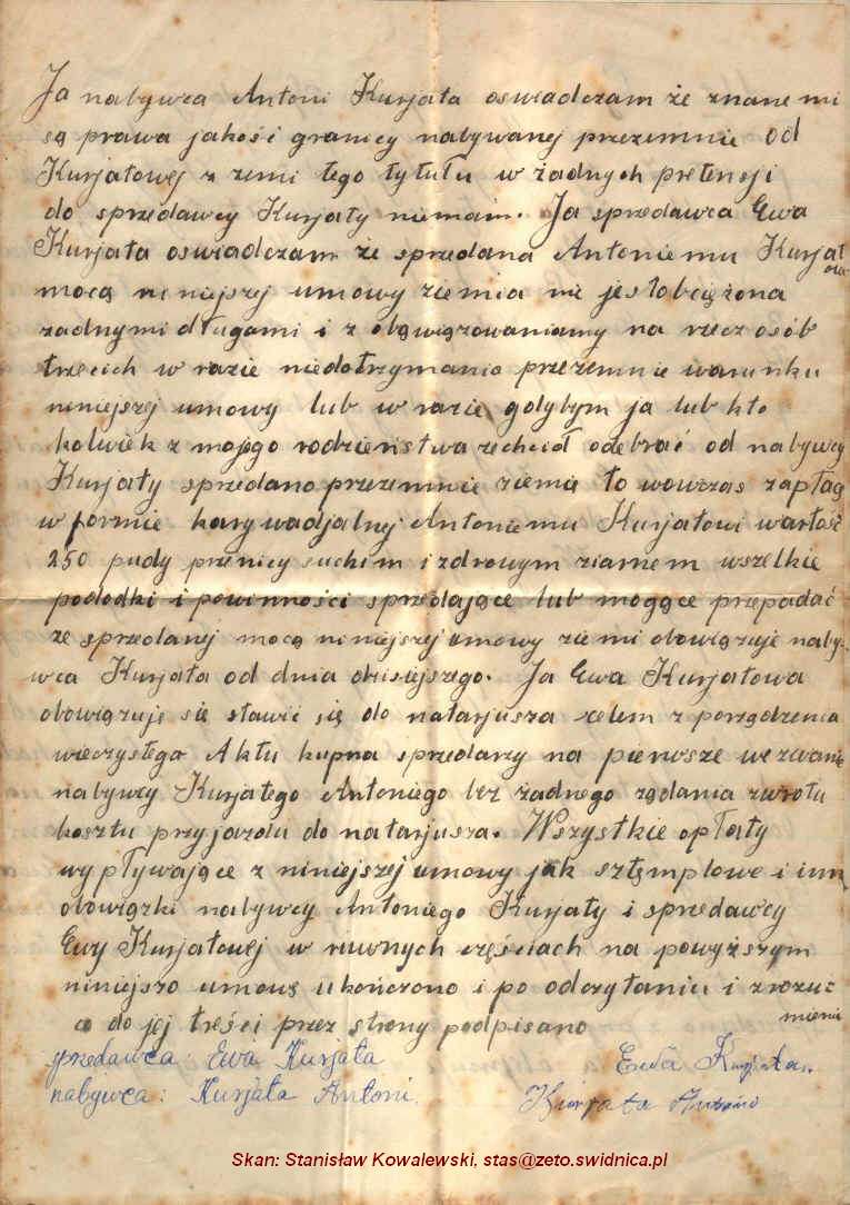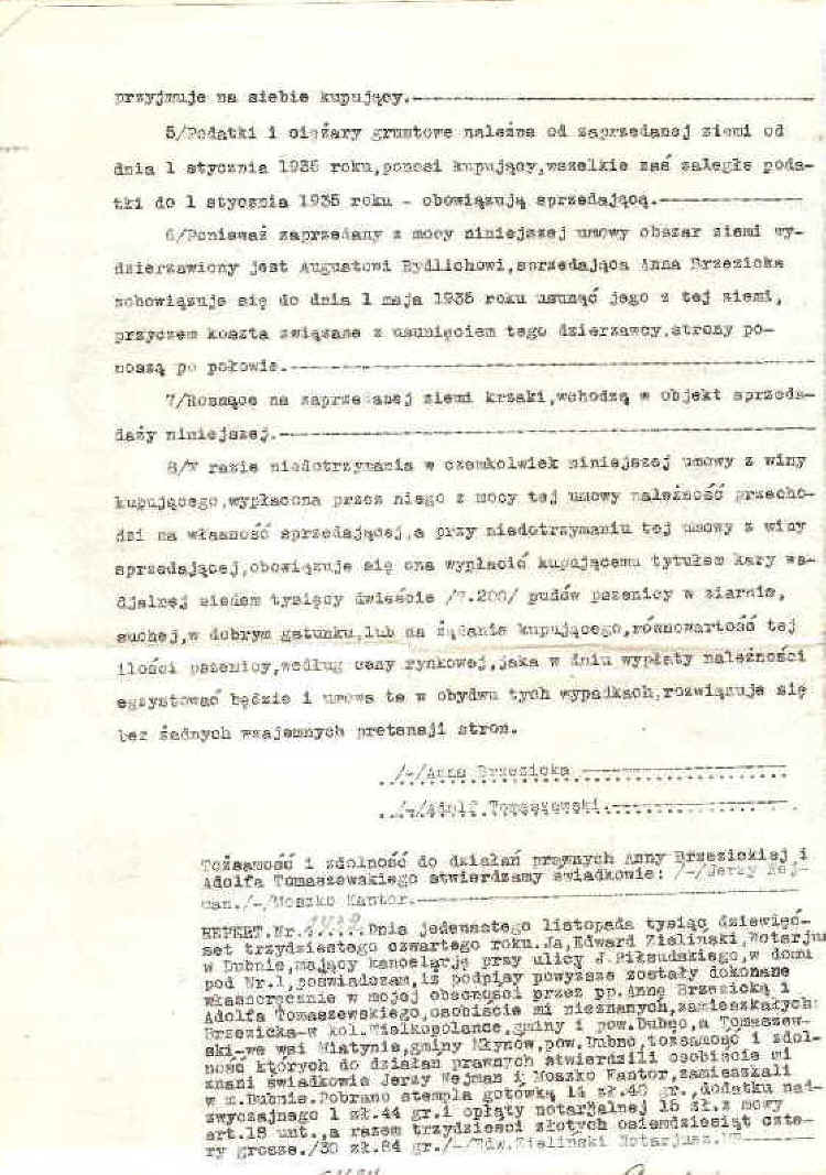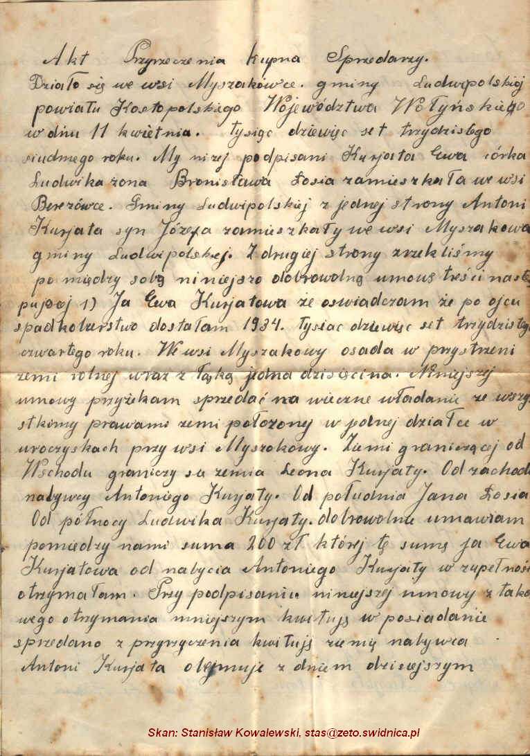 | Umowa kupna-sprzedaży ziemi zawarta pomiędzy Ewą Kuriatową i Antonim Kuriatą, Myszakowa, 1934 r.