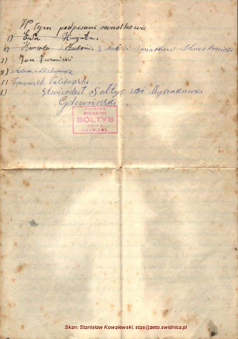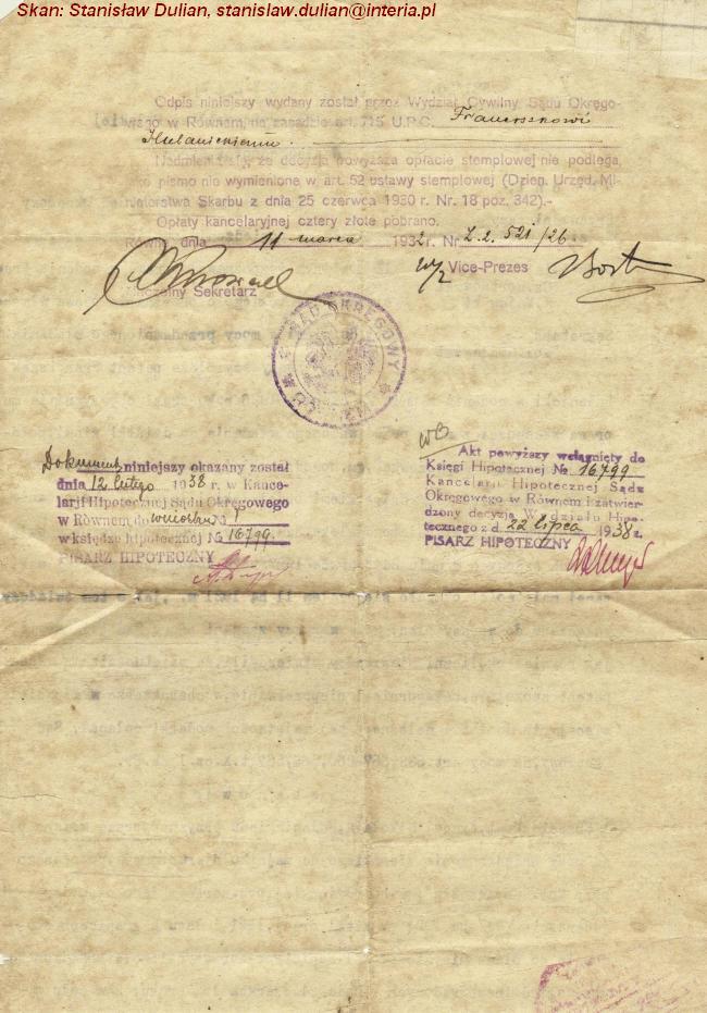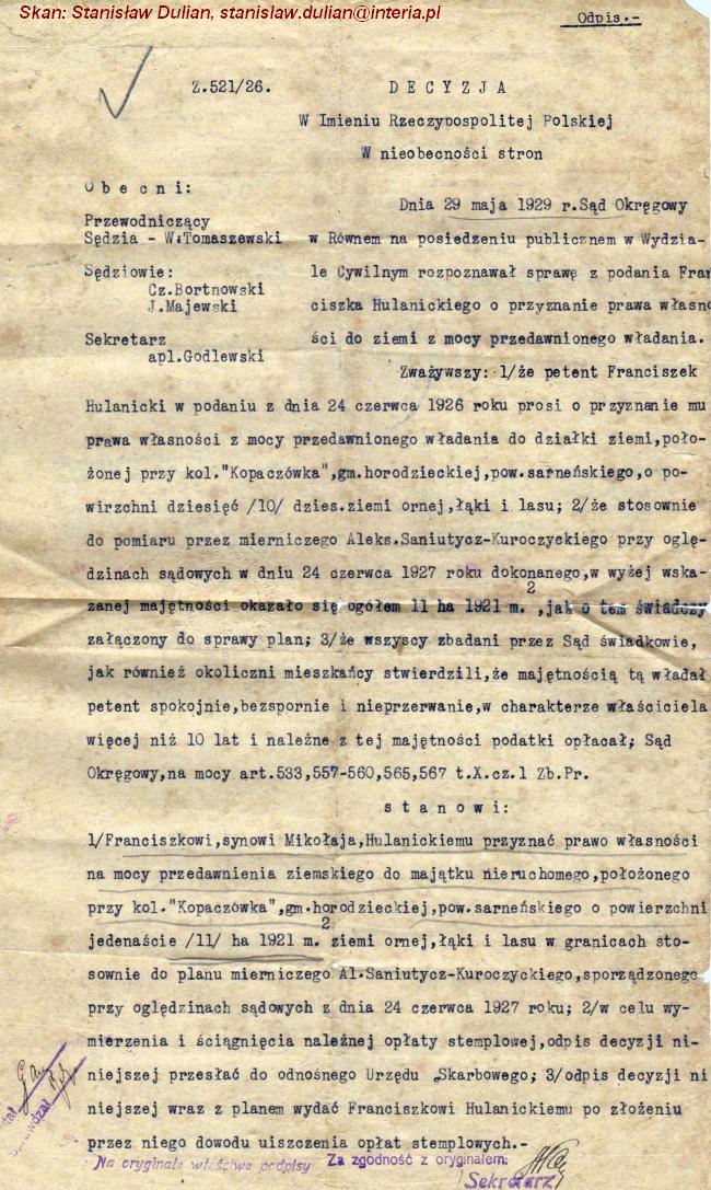 | Decyzja sądu w sprawie przyznania Franciszkowi Hulanickiemu prawa własności do ziemi. | ||