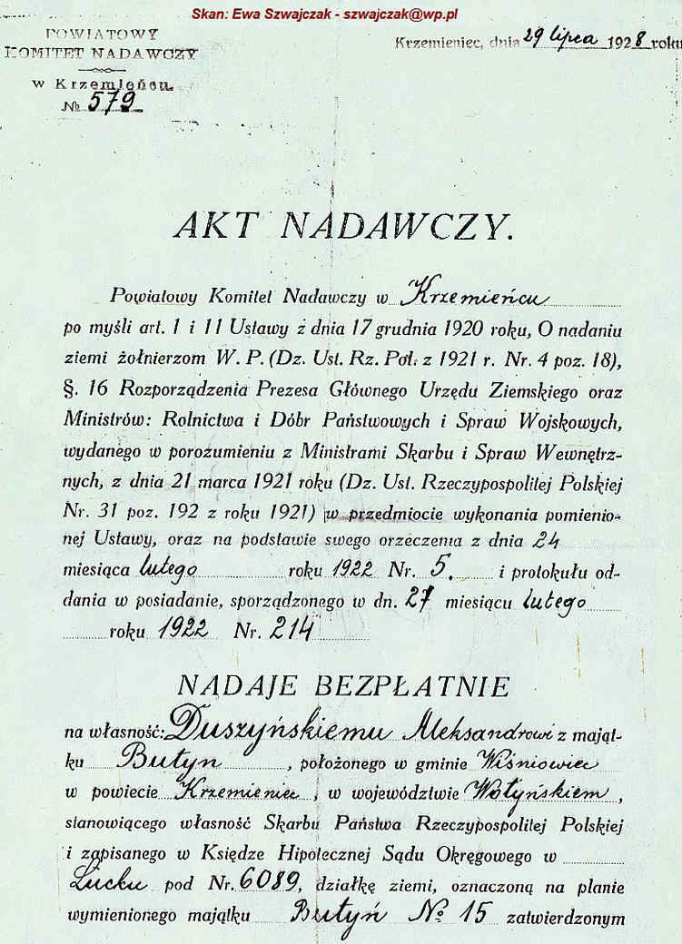 | Akt nadawczy ziemi Aleksandrowi Duszyńskiemu w majątku Butyń, gmina Wiśniowiec | ||