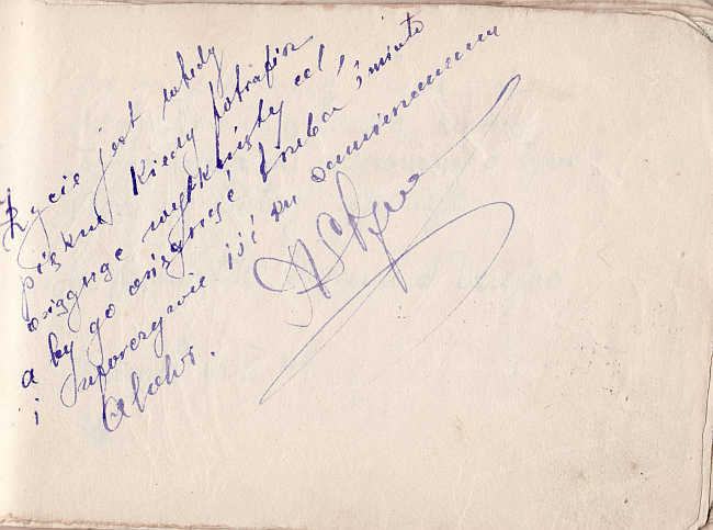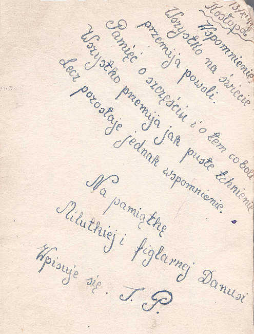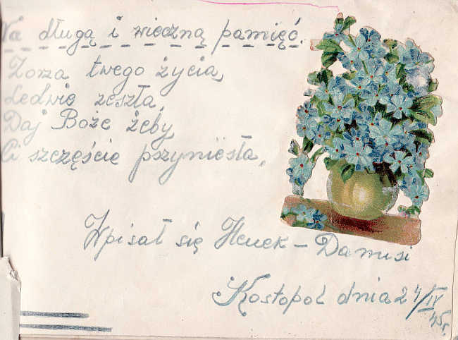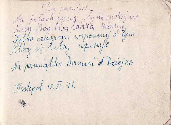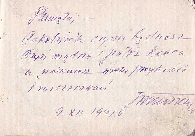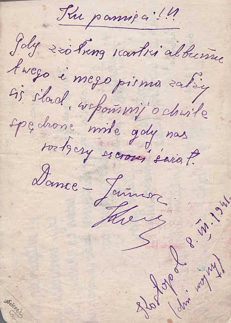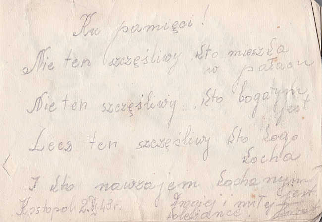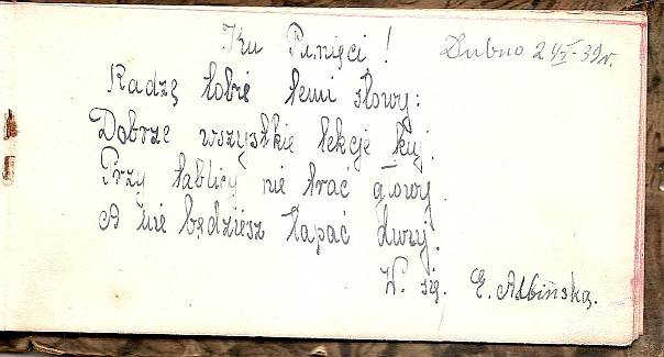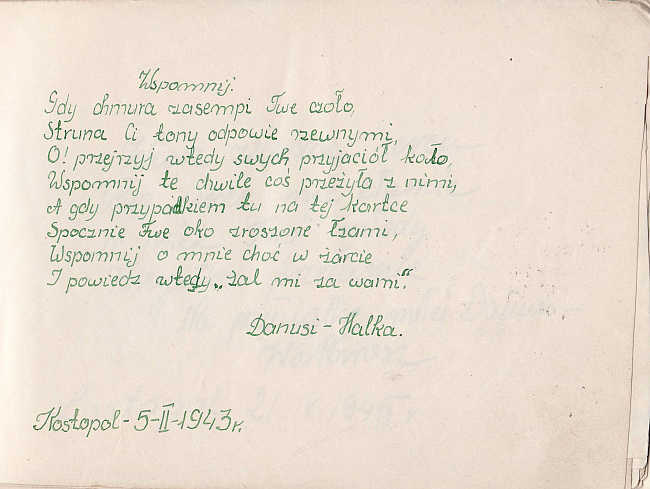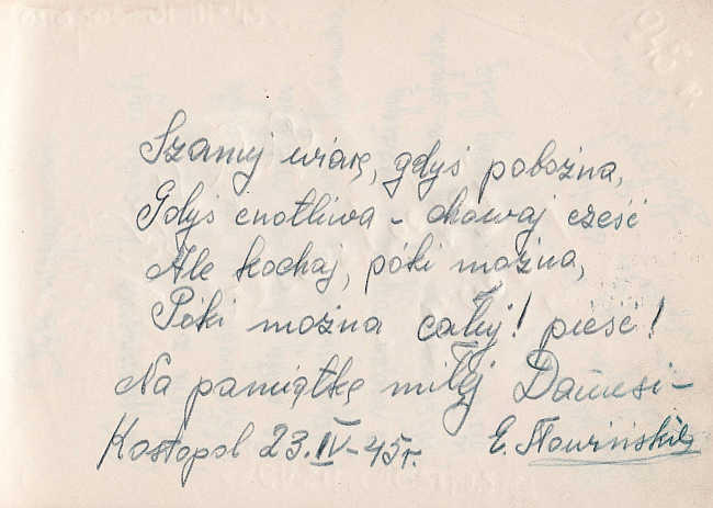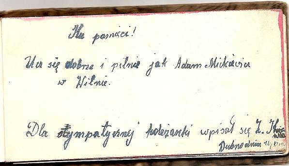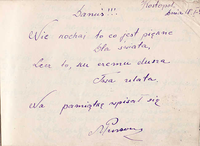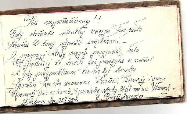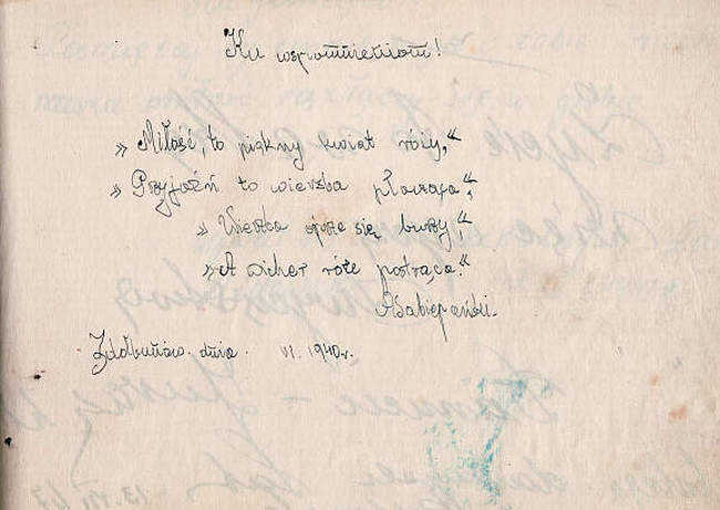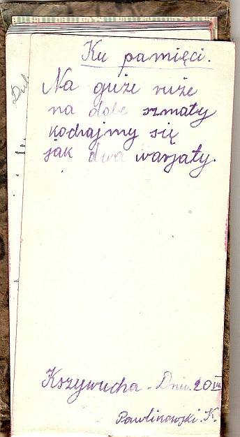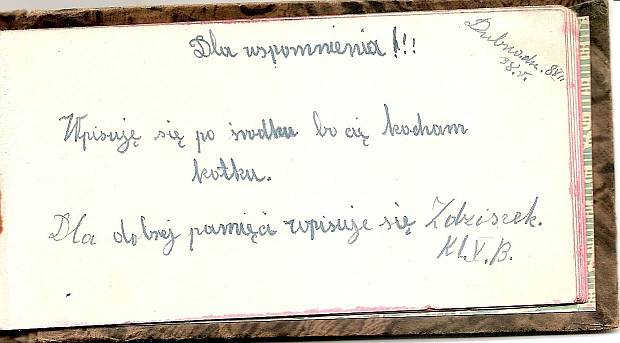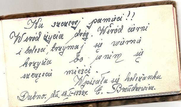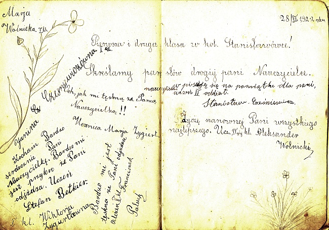| Pożegnalne wpisy w pamiętniku Józefy Paszkowskiej z Łucka, która w roku 1922 była nauczycielką i kierowniczką Szkoły Powszechnej w kolonii Stanisławówka, gm. Ołyka. Przysłał syn Zenon Paszkowski. |