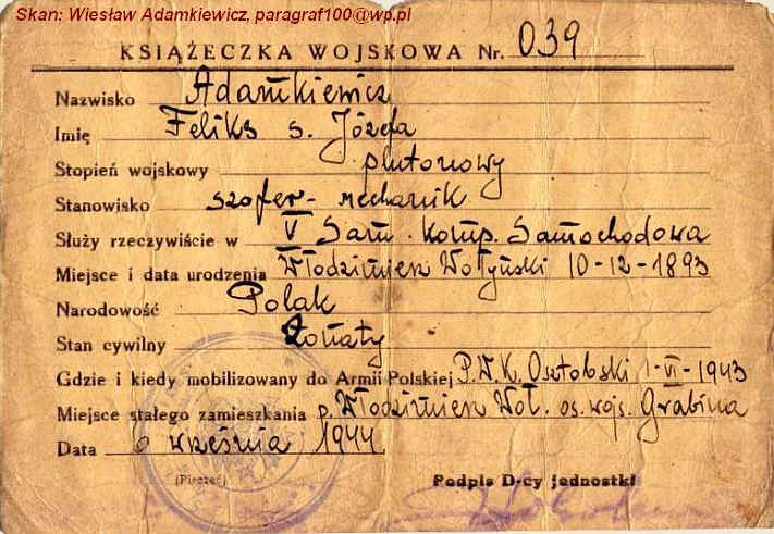 Fragmenty książeczek wojskowych Feliksa Adamkiewicza z Grabiny