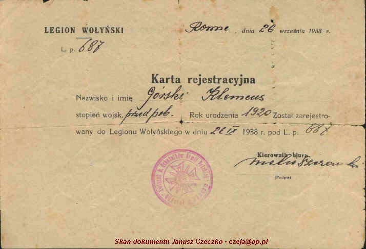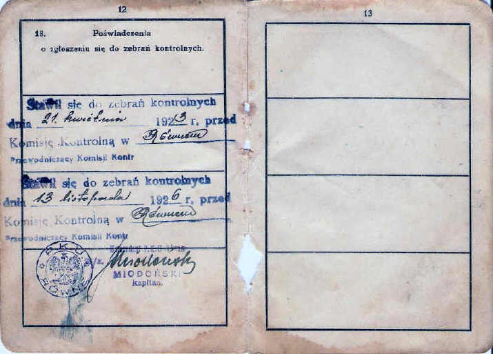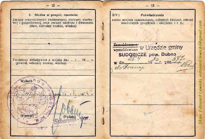| Potwierdzenie wymeldowania w książeczce wojskowej Franciszka Lewickiego (brat Józefa). |