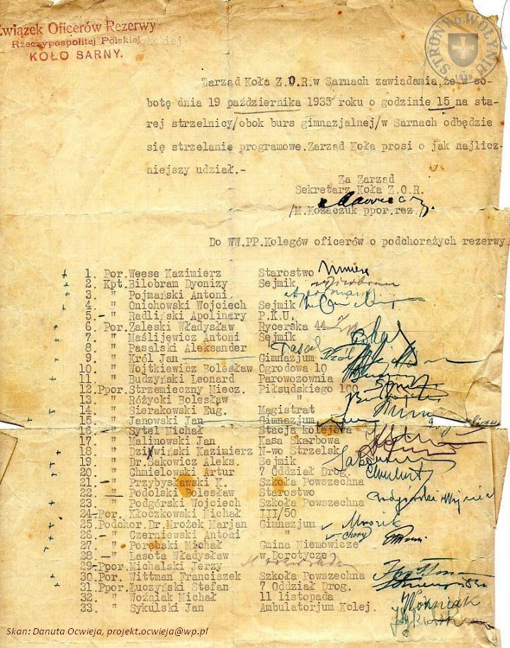 | Lista członków Koła Zwią̨zku Oficerów Rezerwy w Sarnach, powiadomionych o strzelaniu dn. 19.10.1935 r. |