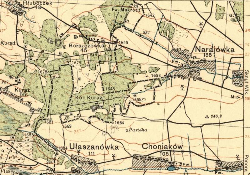 Jadąc z powrotem spotkaliśmy dużo furmanek, które jechały z Borszczówki. Na wozach byli Niemcy i wieźli blachę ze spalonych domów oraz inne rzeczy. I znowu ogarnia mnie strach na widok Niemców. Czy nie byli tam u nas? Bałem się ich strasznie. Sołtys jedzie do Hłuboczka, a ja schodzę z wozu i idę przez pola do Narajówki, do swoich uciekinierów, żony i dzieci. Zmrok już zapadł i było ciemno. Idę i co jakiś czas staję i przysłuchuję się, czy ktoś nie idzie. Wychodzę na górkę. Widzę, że w oddali coś się pali. Akurat w tej samej stronie jest moja sadyba. Dreszcz mnie przeszedł. To znaczy Niemcy byli tam u mnie. Widziałem jak wracali. A może tam do domu wróciła żona z córkami Może już nie żyją? Nie zobaczę ich! Może są pomordowane? Pot na mnie wystąpił, nogi pode mą się uginają. Usiadłem na ziemi. Co robić? Jak dowiedzieć się? Pomału zbliżam się do sadyby. Widzę cień człowieka przy stodole. Podchodzę jeszcze bliżej, poznaję gospodarza, a on mnie. - Został nie spalony dom Myślińskich i jego właśnie Niemcy zapalili. Kamień spada mi z piersi. Zapraszają do mieszkania. Tam gosposie szykują kolację. Gospodarz stawia butelkę bimbru i mówi: Po kolacji i paru kieliszkach siły mnie opuściły. Byłem słaby i bardzo wyczerpany. Do Narajówki było cztery kilometry. Było tak ciemno, że o pięć kroków nic nie było widać. Chciałem iść, ale po usilnej prośbie gospodarzy, zostałem na noc. Spałem jak zabity. Jeszcze było ciemno, jak wyruszyłem w drogę. Już rozwidniło się gdy podchodziłem do Narajówki. Przed wsią spotkałem człowieka od którego dowiedziałem się, że wczoraj w Narajówce byli partyzanci, zranili Niemca, który przypadkowo tam się znalazł. Połowa wsi rozbiegła się po lasach i okolicznych wioskach, reszta ze strachem czeka przybycia Niemców. On sam w tej chwili idzie w lasy. O mojej rodzinie nic nie wie. Powiedziawszy to szybko odszedł. Stałem chwilę namyślając się co robić. Pędzę biegiem do rodziny do Narajówki. Na podwórku spotykam gospodarza. Jakże był zmieniony. Zrobił się czarny na twarzy. - Czekam Niemców i śmierci - powiedział do mnie. Żona pana wczoraj wieczorem poszła z dziećmi w kierunku wsi Sknyt.